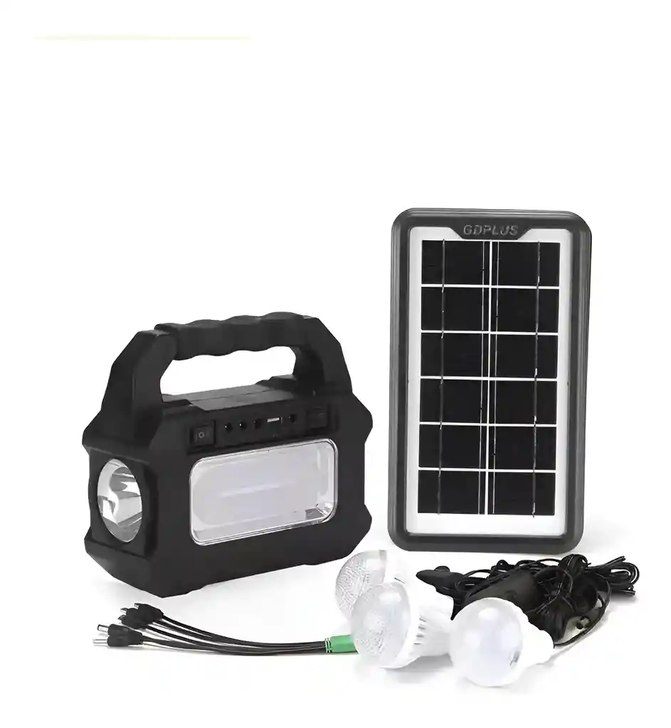 Estación solar portátil universal GDPplus GD-8080 El kit GDPplus GD-8080 garantiza el rendimiento de una variedad de dispositivos si se encuentra lejos de fuentes de electricidad estacionarias. Además, proporciona iluminación por la noche gracias a las bombillas LED incluidas en el kit. Sistema solar universal portátil GDPplus GD-8080, batería de plomo-ácido de 6V. 4500mAh con posibilidad de recargar desde red 220V o desde placa solar. Equipado con un panel solar, tres potentes lámparas LED y un cable USB con 5 adaptadores diferentes para cargar dispositivos. La fuente de alimentación en sí está equipada con dos tipos de iluminación. Con una batería totalmente cargada, el tiempo de funcionamiento es: 30 horas - cuando se usa la primera bombilla 15 horas - cuando se usan 2 bombillas 12 horas - cuando se usan 3 bombillas Características: Tipo de batería: ácido-base Capacidad: 6V, 4500mAh Voltaje de entrada: AC 220-240V, 50-60Hz - de la red DC 9V. – del panel solar Voltaje de salida: CC 6V USB: 5V, 1A Tiempo de carga del panel solar (3,5 W): 10 horas Tiempo de carga desde la red 6 horas Indicador de nivel de batería Tamaño: estación 18*16*8cm, panel 26*14*1,5 cm Peso: 610g Conectores: para placa solar (3-7W.) USB: 5V, 1A. 3 enchufes para lámparas de 6V. Además: Lámparas LED SMD incluidas 3 piezas. La longitud del cable de alimentación 220V es de 0,5 m. Longitud del cable de la lámpara: 3 m. (con interruptor conveniente) Equipo: Fuente de alimentación GDPplus GD-8080 Placa solar 9V, 3,5W. Lámparas LED - 3 uds. Cable USB con 5 adaptadores para cargar teléfonos móviles. Cable USB de carga. Recomendaciones: Para aumentar el rendimiento del dispositivo, recomendamos: 1. Guarde el panel solar con cuidado, trate de no dañar el revestimiento. 2. Limpie el panel solar para eliminar el polvo. 3. Apunte el panel solar directamente al sol. 4. Cargue completamente el dispositivo antes del primer uso desde una red de 220 voltios