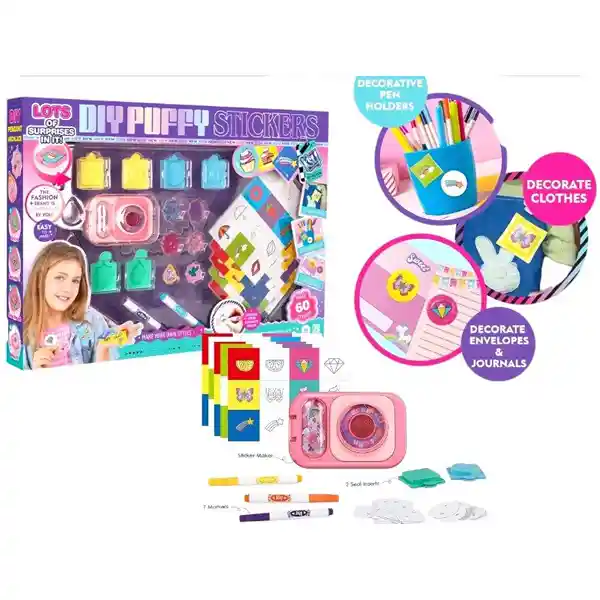 El Kit de Creación de stickers es una divertida y creativa actividad que permite diseñar stickers 3D personalizadas. ¡Dirige tu propio taller con la Fábrica de stickers. Elige entre más de 60 diseños incluidos, algunos coloréalos a tu gusto con los 4 plumones o utiliza las versiones precoloreados para crear más rápido. Medidas: 53x38cm caja