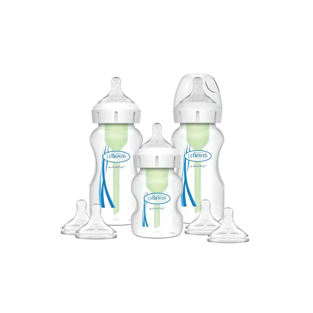 Kit De Inicio Boca Ancha Options+ Dr. Brown’s. Características: Incluye: 1 mamadera bocha ancha 150ml (incluye tetina 0M+). 2 mamaderas boca ancha 270ml (incluye tetina 0M+). 2 tetinas de reemplazo nivel 2 (3M+). 2 tetinas de reemplazo nivel 2 (6M+). Cepillito de limpieza (para tubo interior). Ventajas: Alimentación sin vacío, similar al pecho materno. El bebé sólo toma leche y no aire. Reduce en forma efectiva los cólicos, vómitos, eructos y gases. Ayuda a tranquilizar al bebé. Puede ser usada con y sin el Sistema de Ventilación, cuando el bebé ya no presenta problemas estomacales. Preserva vitaminas C, A E + lípidos. El sistema minimiza la oxidación de la leche. Apta para el lavavajillas (parte superior). Sin BPA. Consejo: Mezclar en un vaso la leche en polvo y el agua, revuelva hasta eliminar las burbujas y espuma, luego vacíe la fórmula en la mamadera Dr. Brown’s. No agitar la mamadera en la preparación.