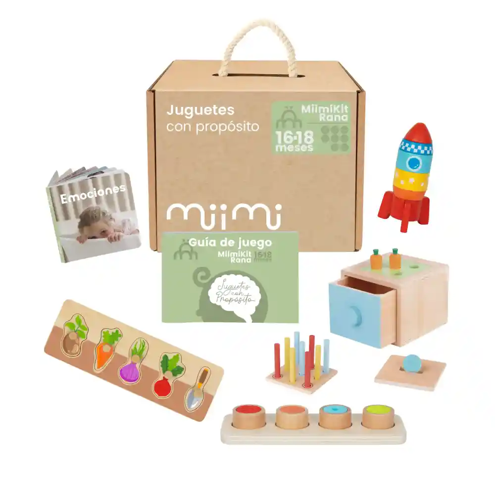 Kit de Juguetes MiimiKit Rana 16 a 18 meses. El Kit de Juguetes MiimiKit Rana está pensado para bebés de 16 a 18 meses. Inspirado en un adorable liebre, este set incluye juguetes que fomentan el desarrollo físico y sensorial, la autonomía, la comunicación y el lenguaje. Cada juguete está elaborado con materiales seguros y duraderos, ideales para las manos y la exploración de tu bebé. Los colores vibrantes, texturas variadas y sonidos atractivos están diseñados para capturar su atención y mantenerlo entretenido mientras aprende y crece. Además, este kit ayuda a promover la concentración, la creatividad y la memoria. Convierte cada momento de juego en una oportunidad de aprendizaje y diversión con MiimiKit Pulpo, el compañero perfecto para los primeros grandes descubrimientos de tu bebé.
