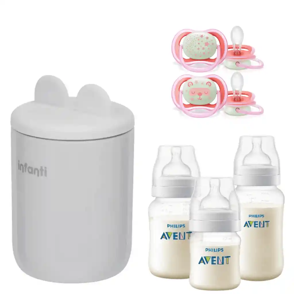 Contenido 1 Calentador Milan 3 Mamaderas avent anti colic 125ml,260ml,330ml 2 Chupetes ultra air avent Calentador Milan Disfruta de una manera rápida y segura de calentar las mamaderas de tu bebé con el calentador de mamaderas Milán INFANTI. Diseñado con tecnología avanzada, este calentador mantendrá la temperatura adecuada para el alimento de tu bebé. Olvídate de preocupaciones, tu bebé siempre tendrá una alimentación con la temperatura perfecta. Su panel digital te indicará a qué temperatura está la leche, facilitándote la tarea de calentarla hasta el mejor punto. ¿Lo mejor? ¡Es muy rápido! Por lo que los llantos no serán necesarios. Tu bebé tendrá rápidamente su leche y tú tendrás su alimento listo en muy corto tiempo. ¡Descúbrelo y disfruta de un cuidado de tu bebé mucho más sencillo! Características: Mantiene la temperatura adecuada para la mamadera de tu bebé Diseño compacto y portátil. Panel digital Calienta rápidamente Incluye cargador de pared Tripack Mamaderas 125ml,260ml,330ml Alivio para tu bebé, tranquilidad para ti! El Tripack de Mamaderas Avent Anti-Colic reduce los cólicos y las molestias, facilitando una alimentación cómoda y segura. Incluye 3 tamaños (125, 260 y 330 ml) para acompañar el crecimiento de tu bebé. 2 Chupetes Ultra Air ¡Máxima comodidad y respiración para tu bebé! Los 2 Chupetes Ultra Air Avent cuentan con orificios de ventilación que permiten que la piel respire, reduciendo irritaciones. Diseño ligero y suave para una succión natural.