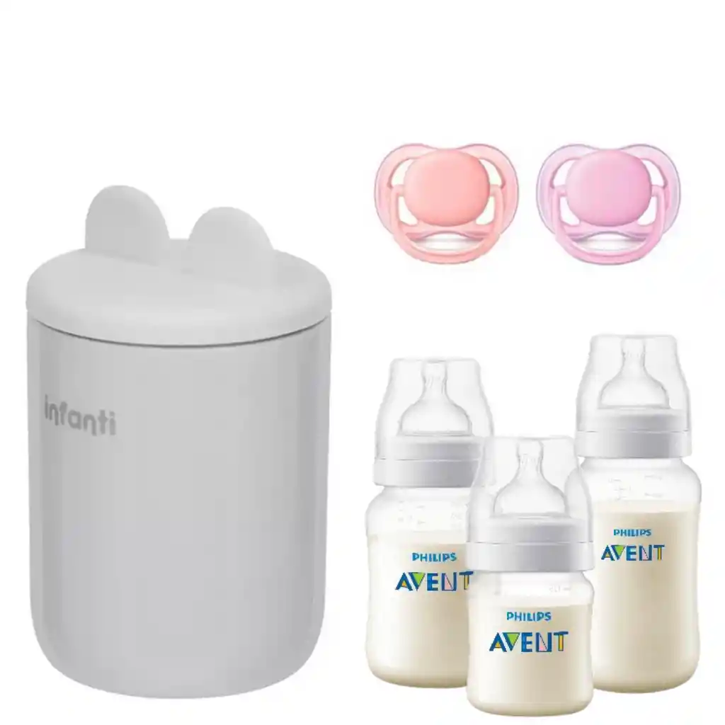 Contenido 1 Calentador Milan 3 Mamaderas avent anti colic 125ml,260ml,330ml 2 Chupetes ultra air avent Calentador Milan Disfruta de una manera rápida y segura de calentar las mamaderas de tu bebé con el calentador de mamaderas Milán INFANTI. Diseñado con tecnología avanzada, este calentador mantendrá la temperatura adecuada para el alimento de tu bebé. Olvídate de preocupaciones, tu bebé siempre tendrá una alimentación con la temperatura perfecta. Su panel digital te indicará a qué temperatura está la leche, facilitándote la tarea de calentarla hasta el mejor punto. ¿Lo mejor? ¡Es muy rápido! Por lo que los llantos no serán necesarios. Tu bebé tendrá rápidamente su leche y tú tendrás su alimento listo en muy corto tiempo. ¡Descúbrelo y disfruta de un cuidado de tu bebé mucho más sencillo! Características: Mantiene la temperatura adecuada para la mamadera de tu bebé Diseño compacto y portátil. Panel digital Calienta rápidamente Incluye cargador de pared Tripack Mamaderas 125ml,260ml,330ml Alivio para tu bebé, tranquilidad para ti! El Tripack de Mamaderas Avent Anti-Colic reduce los cólicos y las molestias, facilitando una alimentación cómoda y segura. Incluye 3 tamaños (125, 260 y 330 ml) para acompañar el crecimiento de tu bebé. 2 Chupetes Ultra Air ¡Máxima comodidad y respiración para tu bebé! Los 2 Chupetes Ultra Air Avent cuentan con orificios de ventilación que permiten que la piel respire, reduciendo irritaciones. Diseño ligero y suave para una succión natural.