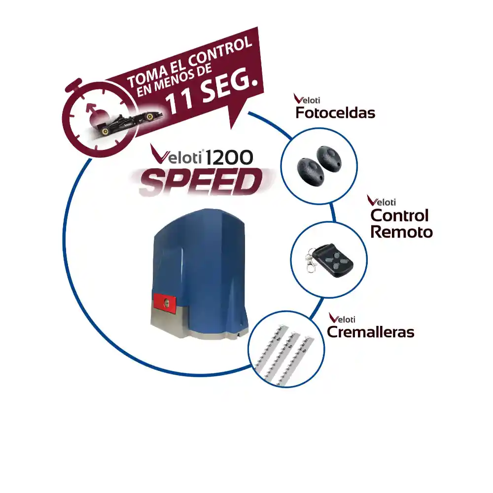 Velocidad de apertura/cierre de 20 m/min. Apertura y cierre inteligente/rampa. Nueva electrónica más velocidad. 40 ciclos de apertura/cierre por hora. Peso referencial: 500 kg. Electrónica de fácil programación. Cremallera Acero. La Cremallera de Acero es indispensable para complementar la instalación de los Motores Veloti. Material de acero. Tiene 1 m de largo. Compatible con Motores para portones Veloti Speed 1200. Es de fácil instalación. Control Remoto Rolling Code permite abrir y cerrar su portón eléctrico de corredera a distancia. Fácil instalación programación y uso. Ejecuta la acción de apertura cierre o interrupción de ambas. Posee 4 botones para configurar.