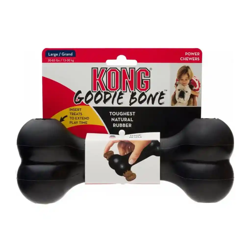 Los KONG Extreme Goodie Bone™ son ideales para perros con dientes fuertes a los que les encanta masticar juguetes. Fabricados con KONG Extreme, una fórmula exclusiva de caucho negro completamente natural y muy resistente, estos huesos están diseñados para masticadores experimentados. El KONG Extreme Goodie Bone™ también cuenta con los Goodie Grippers™ patentados que convierten a este juguete en todo un desafío que deleitará a su perro con las sorpresas que lleva en su interior, ya que puede rellenarse con las croquetas favoritas de su mascota. Talla L: Ideal para perros de 13 a 30 Kg. Medida: 23 cm de ancho x 9 cm de alto