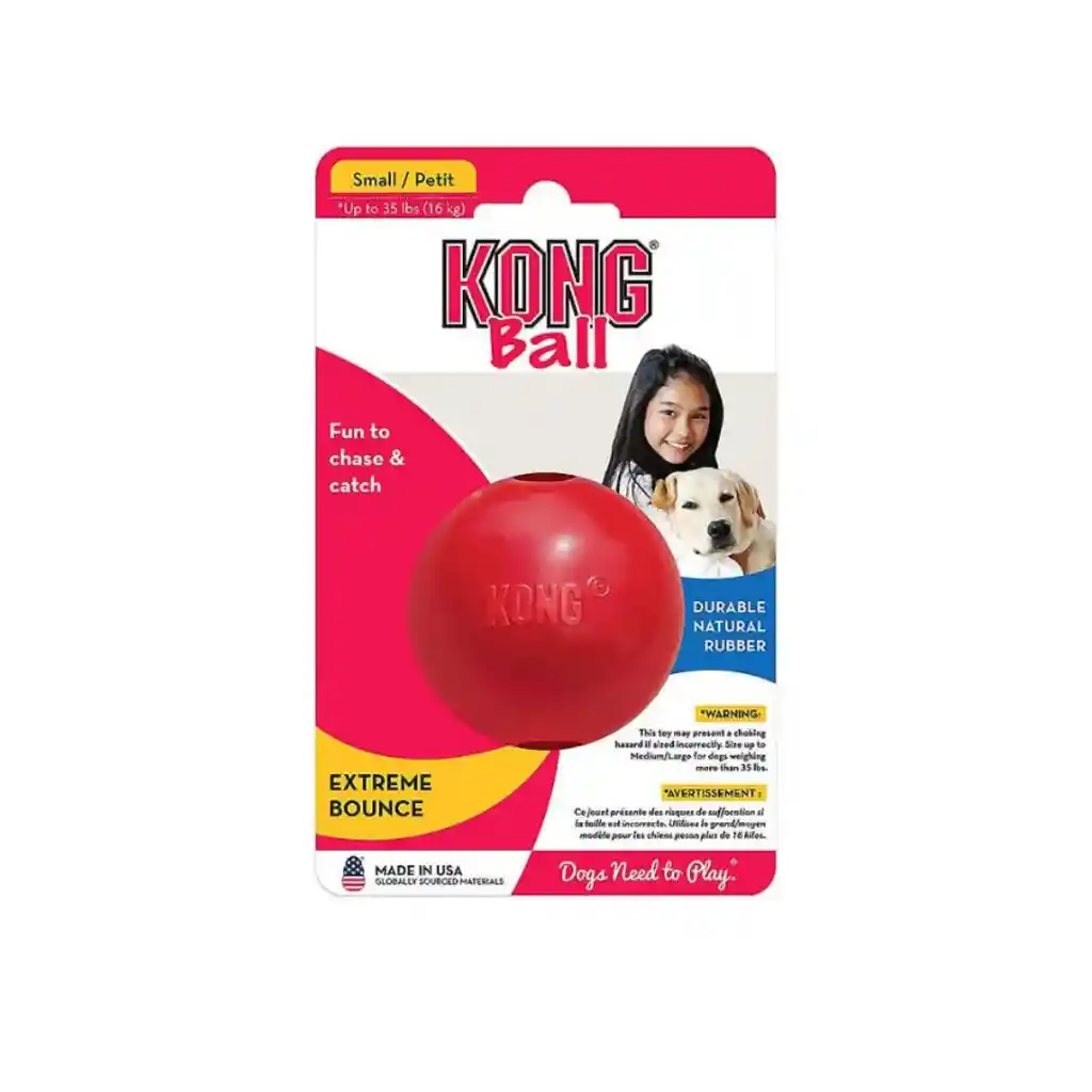 Dos clásicos unidos! La pelota de toda la vida, que vuelve locos a los perros, es ahora también Kong con todas sus ventajas. Rueda y rebota ¡A los perros les encanta! Puede rellenarse con comida o con golosinas y su amigo no podrá resistirse! La mejor forma de que tu perro haga ejercicio, se divierta y fortalezca sus mandíbulas. El juego con objetos satisface la necesidad instintiva de todos los carnívoros de “cazar-capturar-masticar”. Los juguetes Kong rebotan en direcciones impredecibles (simulando la caza) tienen el peso y las medidas de una presa (captura) y una textura elástica que simula el bocado de la presa (masticar). Talla Small: Para perros que pesan hasta 16 kilos. Color: rojo Materiales: Goma extra resistente