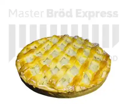 Kuchen con masa en su base relleno de trozos de manzana, cubierto de rejilla de masa, individual.