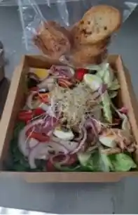 Ensalada fresca, muy rica. Lechuga Escarda, Tomate Cherry, Salmon Ahumado, Pimiento Rojo, Pepino, Mentha Fresca, Alfafa, Croutons Paname, y Limon.