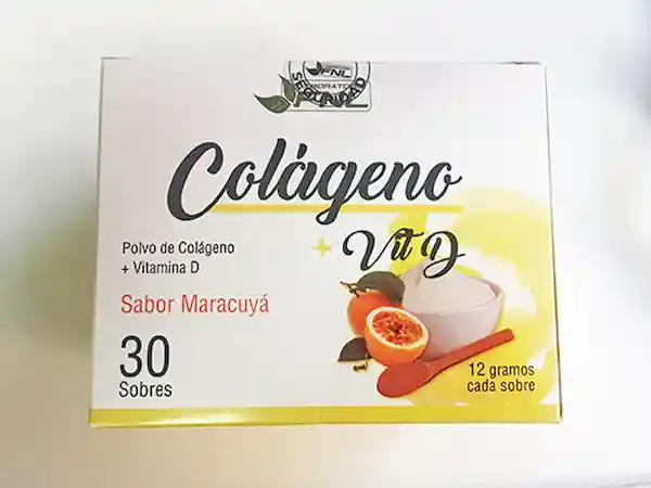 Colágeno/Vitamina D. El Colágeno es Una Proteína Vital Para la Estructura de la Mayoría de Los Tejidos y Órganos Del Cuerpo Humano. Ayuda a Mantener la Elasticidad y Firmeza de la Piel Tonifica y Revitaliza Tejidos Evitando la Aparición de Arrugas. Además Contribuye en el Fortalecimiento Del Sistema Ósea Tendones Tejidos Cartilaginosos y Uñas. Contiene Vitamina D Que Beneficia la Mantención de Niveles Normales de Calcio y Fósforo Circulante en La Sangre. Sabor Maracuyá. Caja Con 30 Und de 12 g c/u