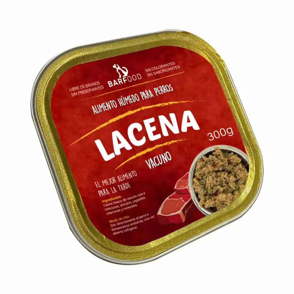 LACENA PERROS es un alimento húmedo cocido que proporciona a los perros una fuente equilibrada de nutrientes esenciales para su salud según sus necesidades carnívoras. Está elaborado con ingredientes de alta calidad, incluyendo carne de vacuno, vísceras de vacuno, vegetales, aceite de omega 3 y 6, almidón, vitaminas y minerales.