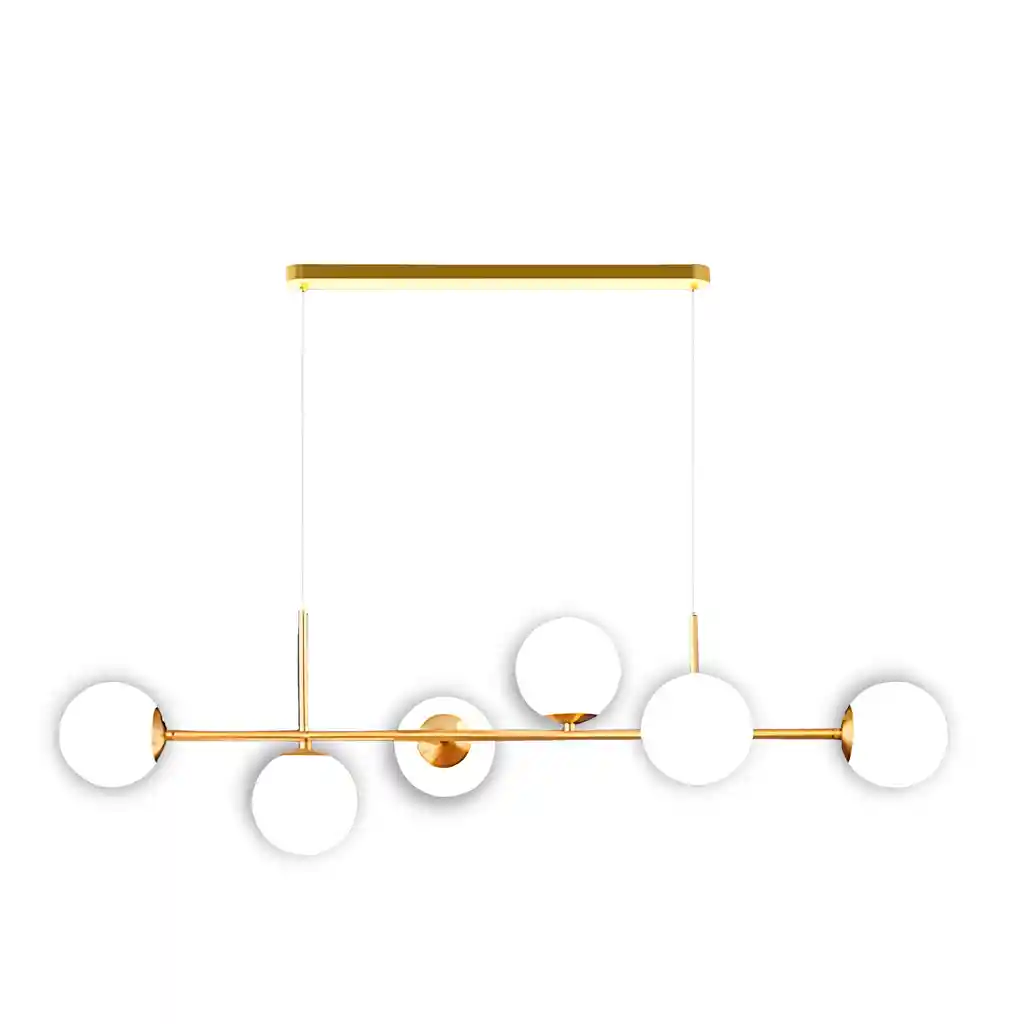 Lámpara Colgante Dorada Techo 6 Luces E27 Led Iluminación Esta luminaria colgante combina un diseño actual con materiales de alta calidad. Su estructura está fabricada en hierro resistente, con un tratamiento especial que la protege contra la corrosión y el desgaste, mientras que su pantalla de cristal permite una excelente difusión de la luz, brindando una iluminación suave, sin destellos molestos. Esta lámpara aporta un aire retro-contemporáneo a tus espacios. Su acabado en latón cepillado y forma lineal destacan sobre islas de cocina, mesas de comedor o pasillos, creando un ambiente acogedor y sofisticado. El cable colgante permite regular la altura según tus necesidades, lo que la hace compatible tanto con techos bajos como altos. También puede instalarse sin problemas en techos inclinados, lo que la convierte en una excelente opción para múltiples tipos de arquitectura. Gracias a su diseño práctico, esta lámpara se monta con facilidad en cualquier techo. Incluye un manual claro para conectar rápidamente. Ideal para su uso en diversos espacios: cocina, living, comedor, dormitorios, entradas o incluso oficinas, cafés y restaurantes. Los tonos de iluminacion son los 3 clasicos, que serian, blanco, neutro y calida, especial para cualquier momento del dia, depende de tus gustos. Con líneas limpias y una pantalla de vidrio blanco opalino, esta lámpara colgante destaca por su estética refinada. Su fabricación con materiales duraderos y acabados de alta precisión la convierte en una pieza que no solo ilumina, sino que también decora con estilo. Su estructura está hecha de hierro con recubrimiento horneado antioxidante, lo que garantiza durabilidad y una superficie suave al tacto. La pantalla de vidrio proporciona una iluminación clara, generando un efecto visual cálido y acogedor. Perfecta para hogares, departamentos o proyectos más amplios como villas, edificios y espacios comerciales. Funciona muy bien en salas de estar, dormitorios, pasillos, oficinas, bibliotecas, cafés y más. Especificaciones: Color: Dorado Material: Hierro Voltaje: 220V Focos: 6 Focos. Jso: Sala, comedor, dormitorio. Tipo de ampolleta: E27 (no incluida) Área de iluminación recomendada: 30 a 40 m² Dimensiones: 106 X 170 CM Conexión eléctrica directa Tonos de iluminación: 3 Tonos. Paquete contiene: 1 Lámpara Colgante Dorada Techo 6 Luces.
