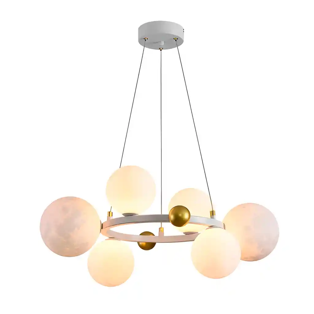 Lámpara Cristal Esferas 6 Cabezas Techo Colgante Plafón Decoración 60 X 32 CM Agrega un toque de modernidad y elegancia a tus espacios con esta lámpara de techo de 6 cabezales, perfecta para realzar cualquier ambiente con un diseño impactante y contemporáneo. Diseñada para complementar una amplia variedad de estilos decorativos, esta luminaria es compatible con espacios como: entradas y pasillos, comedores y cocinas, vestíbulos, salas de estar y salas de reuniones, salones de recepción o espacios comerciales. Ya sea para modernizar tu comedor o dar un nuevo aire a tu sala, esta lámpara de techo es la elección perfecta. Luz, diseño y elegancia en una sola pieza. Su estructura de 60 cm x 32 cm presenta un formato visual atractivo, ideal para techos de altura estándar. 6 brazos de iluminación distribuyen la luz de forma equilibrada en toda la habitación. Fabricada con materiales duraderos y detalles decorativos modernos que aportan un look sofisticado. Nota: No incluye ampolletas. Soporta ampolletas con casquillo E27 (se recomienda usar LED para mayor eficiencia energética). Fácil de Instalar Con una estructura sencilla y bien diseñada, esta lámpara de techo se instala fácilmente, permitiéndote renovar tu espacio en pocos pasos. Ideal para proyectos de decoración sin complicaciones. Especificaciones: - Material: Metal resistente, teflon. - Color: Blanco - Dimensiones: 60 cm de ancho x 32 cm de alto. - Casquillo compatible: E27 x 6 (ampolletas no incluidas). - Uso recomendado: Interior. - Tipo de lampara: Techo. - Instalación: Montaje de techo fácil y rápido - Voltaje: 220V - Estilo: Moderno / Minimalista / Decorativo. - Una luminaria con carácter, estilo y funcionalidad. - Consumo energético: Bajo consumo, alta eficiencia - Paquete contiene: 1 Lámpara Cristal Esferas 6 Cabezas Techo Colgante Plafón Decoración 60 X 32 CM