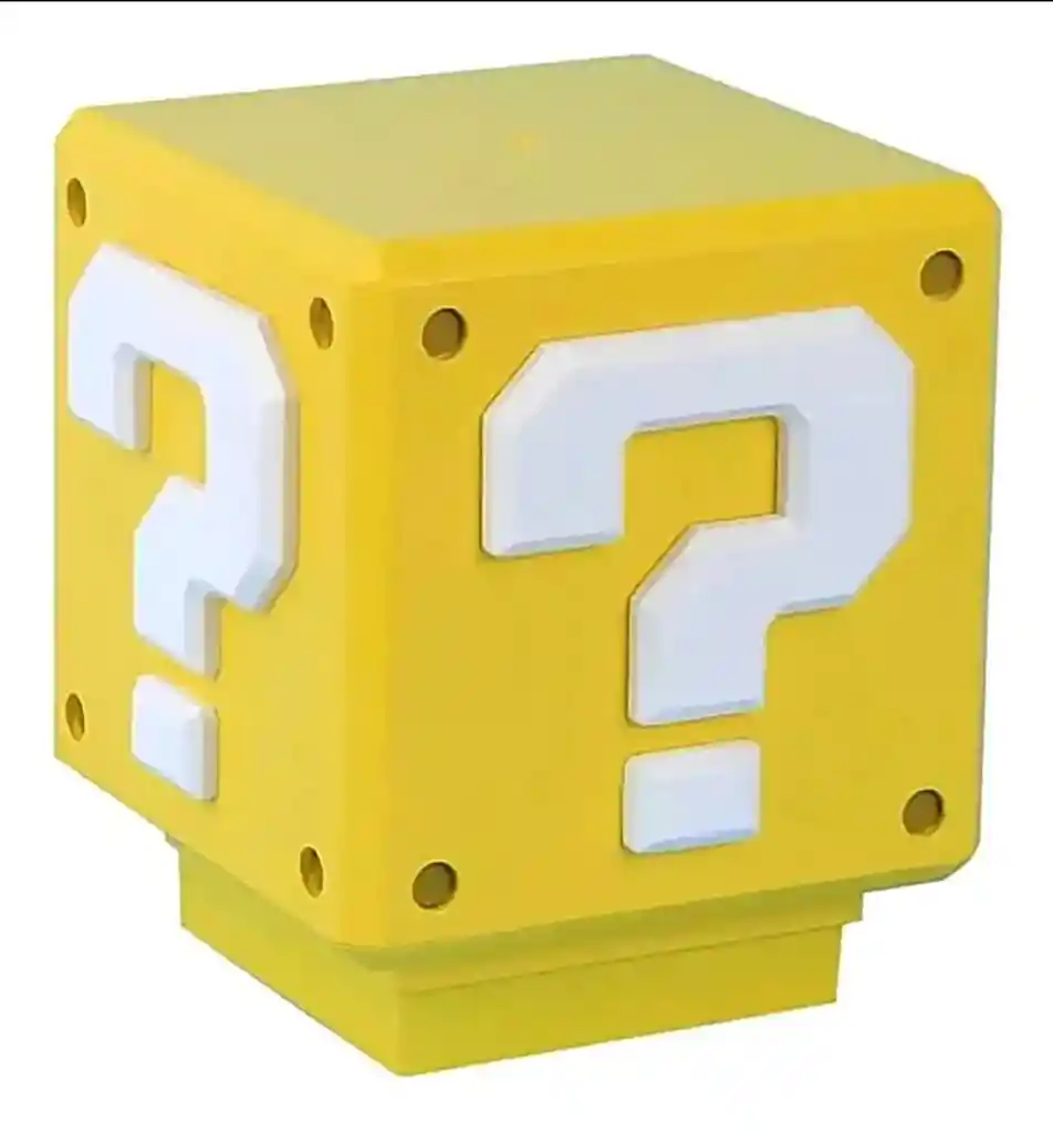 Descripción: Deja que este minibloque de preguntas de Mario ilumine tu vida aportando un poco de infancia a tu espacio. La mejor parte es que cuando presionas la lámpara, se enciende o apaga y reproduce el sonido de la moneda del juego. Super Mario Bros. Licencia Luz en forma de bloque de preguntas Activa y desactiva la luz y emite el sonido de la moneda del juego al pulsar la parte superior Ideal para dormitorios o como luz decorativa sobre una mesa Signos de interrogación extruidos en los laterales para mayor realismo Datos técnicos: Material: PVC Tamaño: 10 cm Recargable