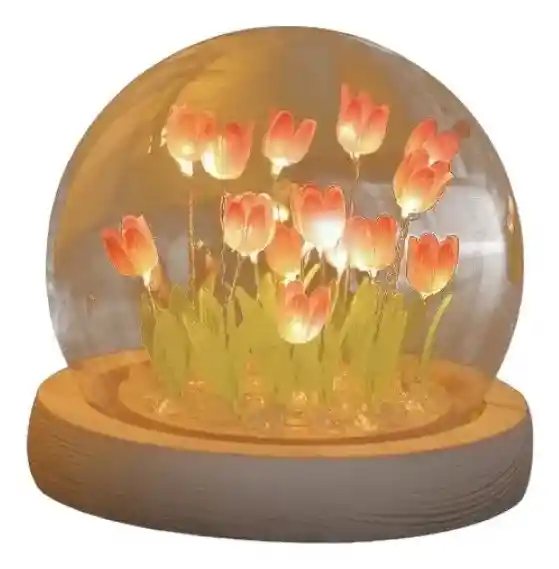 Esta encantadora lámpara está hecha de vidrio y madera y cuenta con hermosos tulipanes delicadamente colocados debajo de una cúpula de vidrio. Su diseño atemporal encajará perfectamente en cualquier hogar y hará una declaración impresionante en cualquier habitación. La luz nocturna se puede utilizar como acento decorativo o como luz nocturna para disfrutar todas las noches. Disfruta de una luz suave y relajante que aportará confort y calidez a cualquier espacio.
