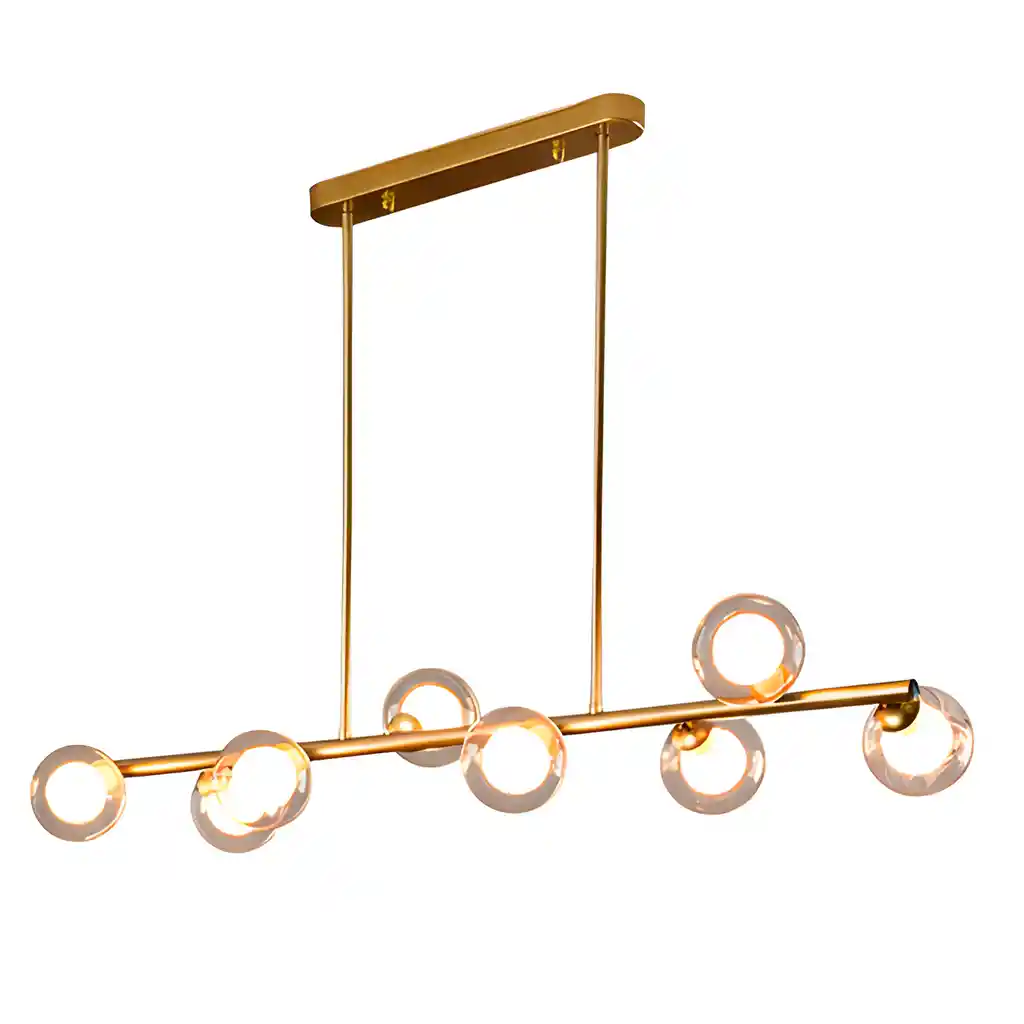 Lámpara Dorada Colgante Dorado Araña Techo Sala de Estar 8 Bombillas 100 X 32 CM Eleva el diseño de tu hogar con esta sofisticada lámpara de techo de 8 focos, ideal para quienes buscan un estilo moderno con toques clásicos. Su diseño de líneas limpias y materiales nobles la convierte en el complemento perfecto para interiores contemporáneos, minimalistas o de inspiración europea. Con una estructura fabricada en hierro de alta resistencia y elegantes pantallas de vidrio tipo esfera, esta lámpara combina durabilidad con estilo. Cada detalle ha sido pensado para brindar una iluminación cálida y uniforme, sin deslumbramientos, generando una atmósfera acogedora y refinada en cualquier ambiente. Gracias a sus 8 brazos, esta lámpara es capaz de iluminar eficazmente áreas amplias como salones, cocinas, comedores o salas de estar. Ideal para hogares que buscan no solo funcionalidad, sino también una pieza decorativa con carácter. Construida con hierro fundido de alta calidad, esta lámpara garantiza firmeza, estabilidad y larga vida útil. La pintura aplicada ofrece un acabado impecable y resistente, mientras que las pantallas de vidrio aportan un toque artístico y moderno. La luz que emite es suave, difusa y agradable a la vista. Aunque requiere una conexión directa a la red eléctrica (cableado empotrado), su instalación es sencilla y rápida. Solo necesitas fijarla con tornillos a la pared o techo, conectar los cables según las instrucciones y estará lista para usarse. Perfecta para una amplia variedad de espacios: Interiores residenciales: sala de estar, comedor, cocina, pasillos, escaleras. Espacios comerciales: cafeterías, bares, galerías, tiendas, showrooms o restaurantes. Decoración de casas modernas o con estilo europeo. Especificaciones: Materiales: Metal Voltaje: 220v Tipo de lampara: Techo. Dimensiones:100 X 32 CM Diseño: Lineal Colores: Dorado Instalación: Fácil Área de iluminación: 12 - 16 mts2 Uso recomendado: Sala, comedor, tiendas. Paquete contiene: 1 Lámpara Dorada Colgante Dorado Araña Techo Sala de Estar 8 Bombillas 100 X 32 CM
