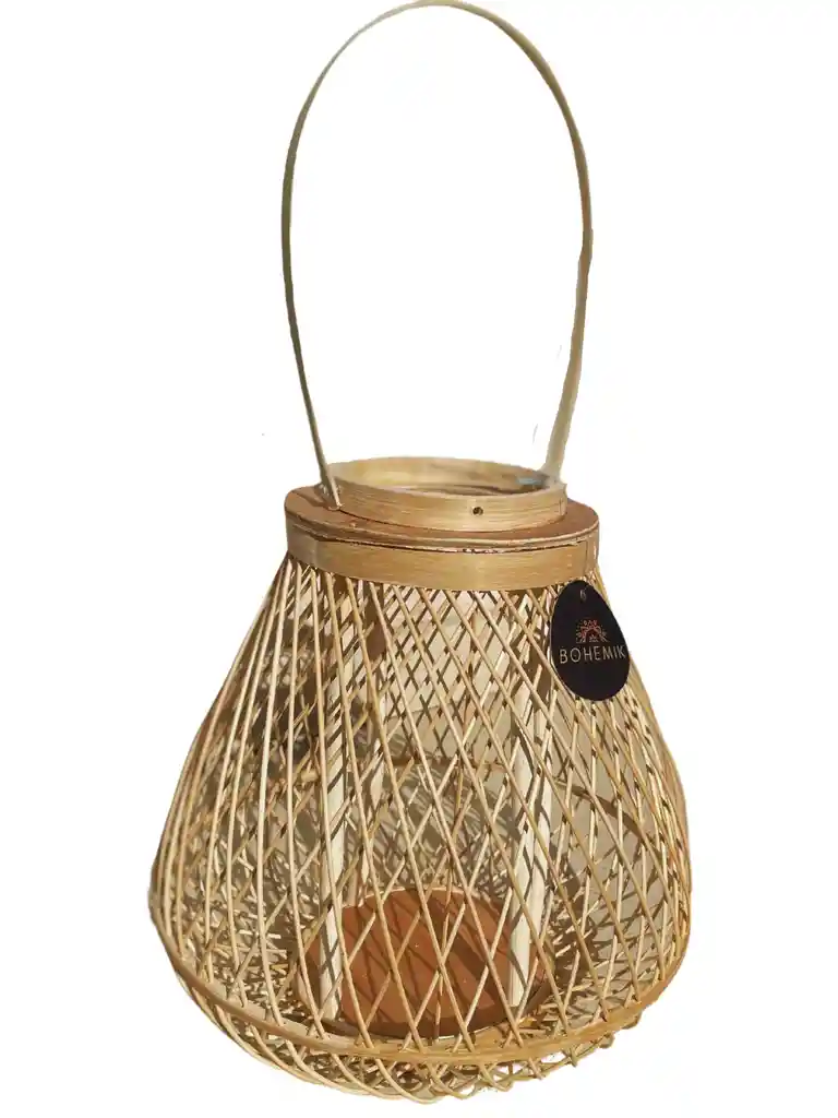 Lámpara de mesa tipo farol porta velas confeccionada a mano en bambú con Asa, ideal para decorar espacios interiores y terrazas, puede ser dispuesta en piso, mesa o colgada. Dimensiones: - Diámetro mayor: 25 cm. - Diámetro menor: 13 cm. - Altura Asa: 16 cm. - Alta lámpara: 17 cm. - Alta total: 33 cm. (con asa extendida) - Peso: 400 Grs.