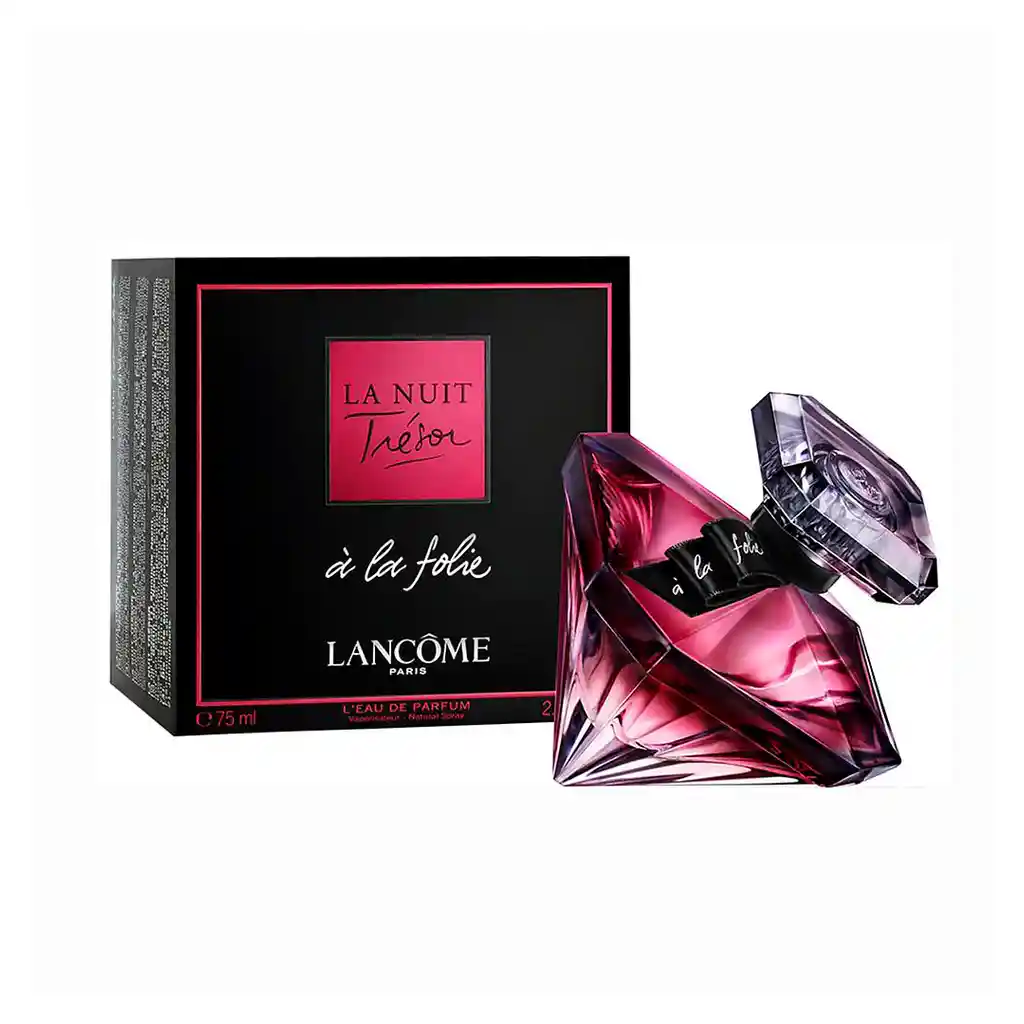 La Nuit Trésor à la Folie de Lancome es una fragancia de la familia olfativa Ámbar Vainilla para Mujeres. La Nuit Trésor à la Folie se lanzó en 2018. La Nuit Trésor à la Folie fue creada por Christophe Raynaud, Amandine Clerc-Marie y Honorine Blanc. Las Notas de Salida son grosella roja, pimienta rosa, pera y bergamota Las Notas de Corazón son rosa de Damasco, violeta, peonía y jazmín Las Notas de Fondo son vainilla Bourbon, haba tonka, benjuí, nuez moscada, ambroxan, pachulí y notas amaderadas