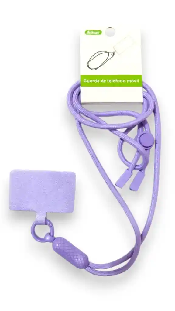 Cuerda lisa color lila con textura suave y resistente. Incluye ajuste regulable y placa para fijar el teléfono móvil.