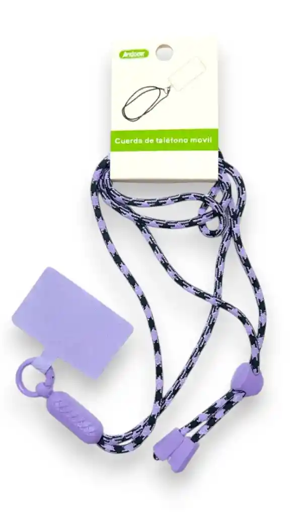 Cuerda trenzada bicolor lila con negro, resistente y ajustable. Incluye soporte universal y tope regulable, ideal para uso diario.