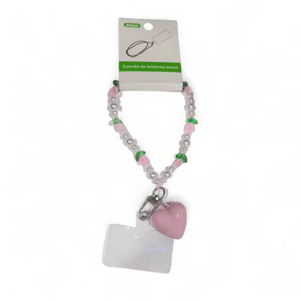 Lanyard de muñeca con diseño decorativo de cuentas tipo perla, detalles verdes y colgante de corazón rosa. Incluye placa universal para teléfono móvil. Ideal para un look femenino y delicado.