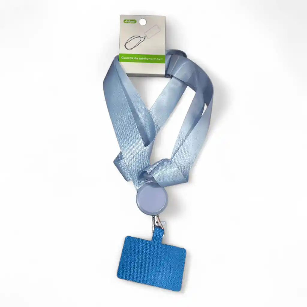 Lanyard satinado para teléfono móvil en color celeste, suave al tacto, liviano y cómodo, con sistema de sujeción universal.