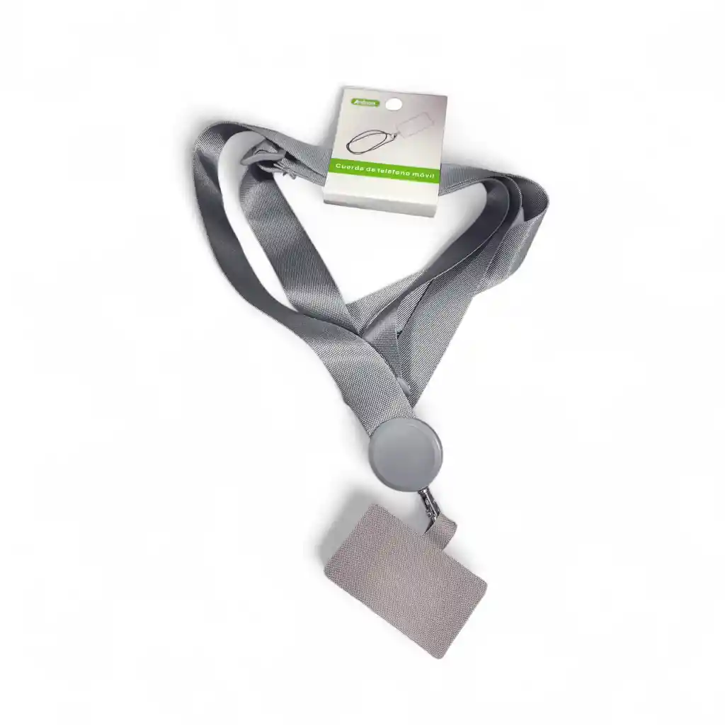 Lanyard satinado para teléfono móvil en color gris, elegante y resistente, ideal para uso diario y transporte seguro del celular.