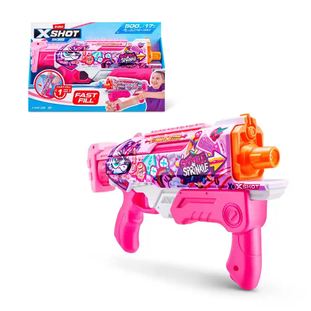 El lanza agua Hyperload skins 500 ml con sistema de llenado rápido Fast Fill de X-Shot es un juguete para pasar un día divertido con amigos y familiares en la playa, la piscina o el parque. Con su diseño ergonómica y su fácil manejo, es perfecto para niños de a partir de 6 años. Este lanza agua tiene un tanque con capacidad de 500 ml, que les permitirá disparar chorros de agua hasta 10 metros de distancia. Su sistema de llenado rápido Fast Fill les permite rellenarlo en 1 segundo para que puedan volver a la acción en un abrir y cerrar los ojos. Además de sus características técnicas, este lanza agua ayuda a los niños desarrollar sus habilidades motoras finas, la coordinación mano-ojo, la puntería y la orientación espacial, siendo este una excelente opción de regalo para niños de todas las edades, para disfrutar durante los días de verano.