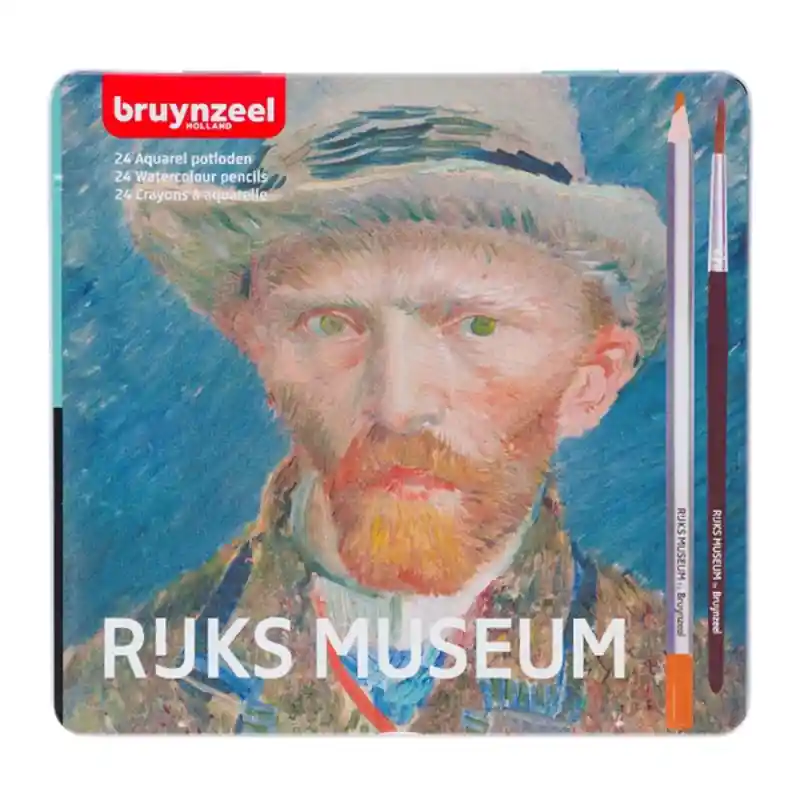 Estuche metálico con 24 lápices de colores acuarelables diferentes. Incluye pincel. La colección RIJSK MUSEUM consta de 4 cajas impresas con las obras de los Grandes Maestros holandeses. Las cajas, al igual que los lápices, tienen un acabado mate que les da un aspecto lujoso. Esta caja contiene autorretrato de Vincent Van Gogh.