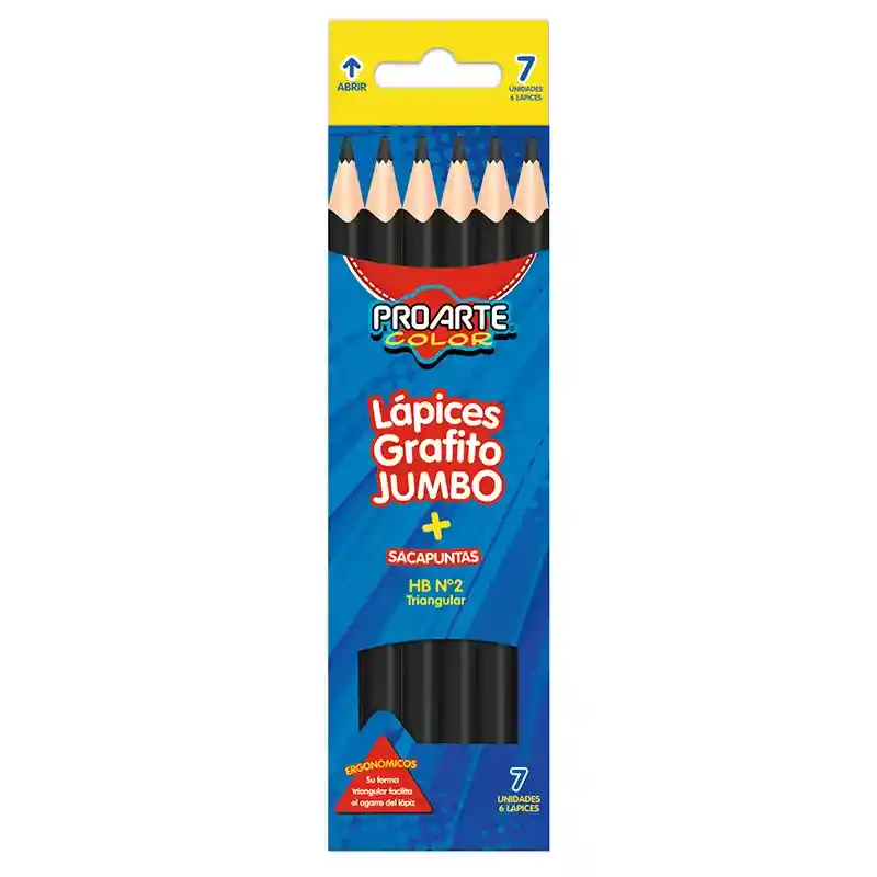 Pack de 6 lápices grafito N°2 en formato jumbo con diseño triangular para mejor agarre, ideal para niños y etapa escolar. Incluye sacapuntas para mayor practicidad. Mina resistente y trazo suave para escribir y dibujar con comodidad.