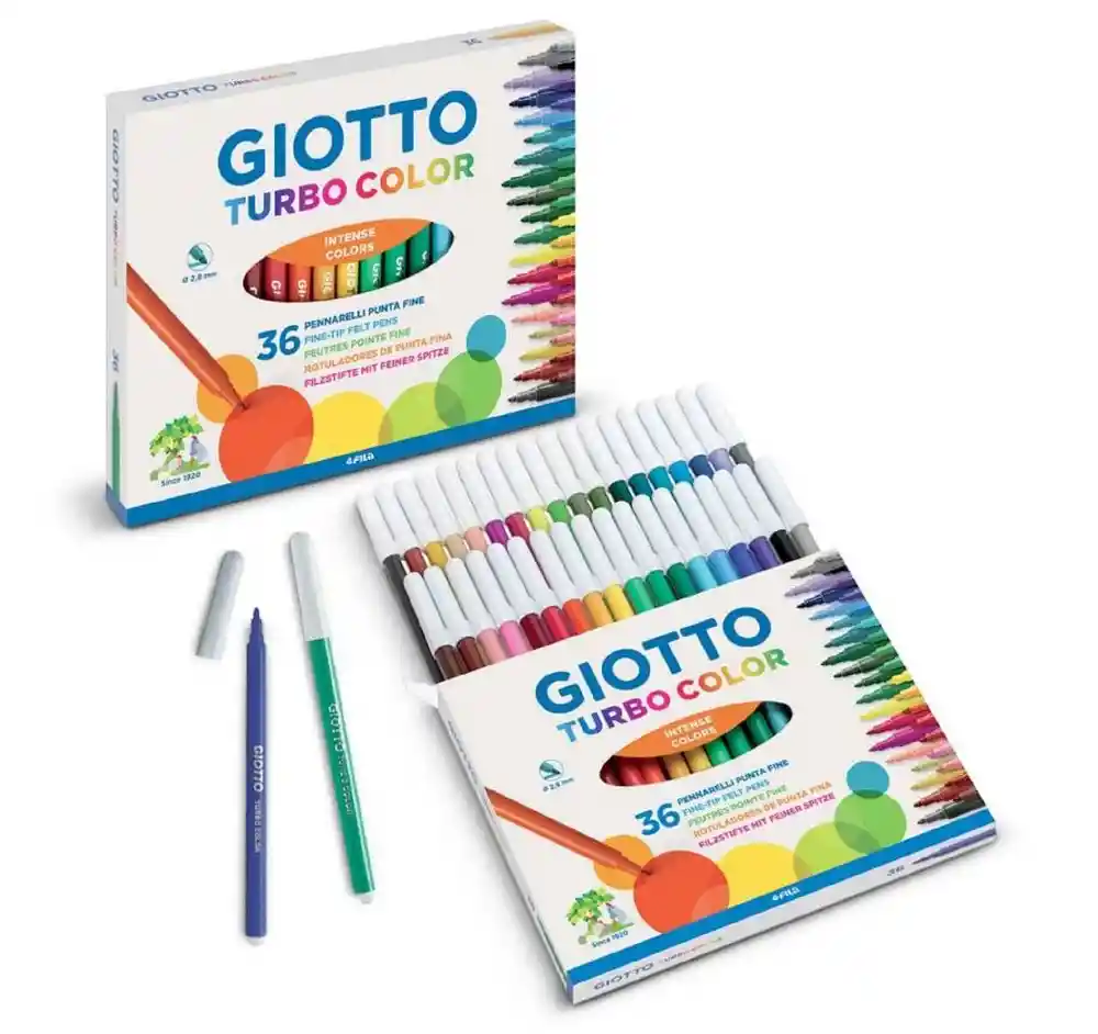 Lápices Scripto-Marcador Fino Giotto Turbo Color 36 colores. Marcadores escolares, punta indestructible de 2,8 mm que recupera su forma original. Son lavables, no tóxicos y están fabricados en Italia.