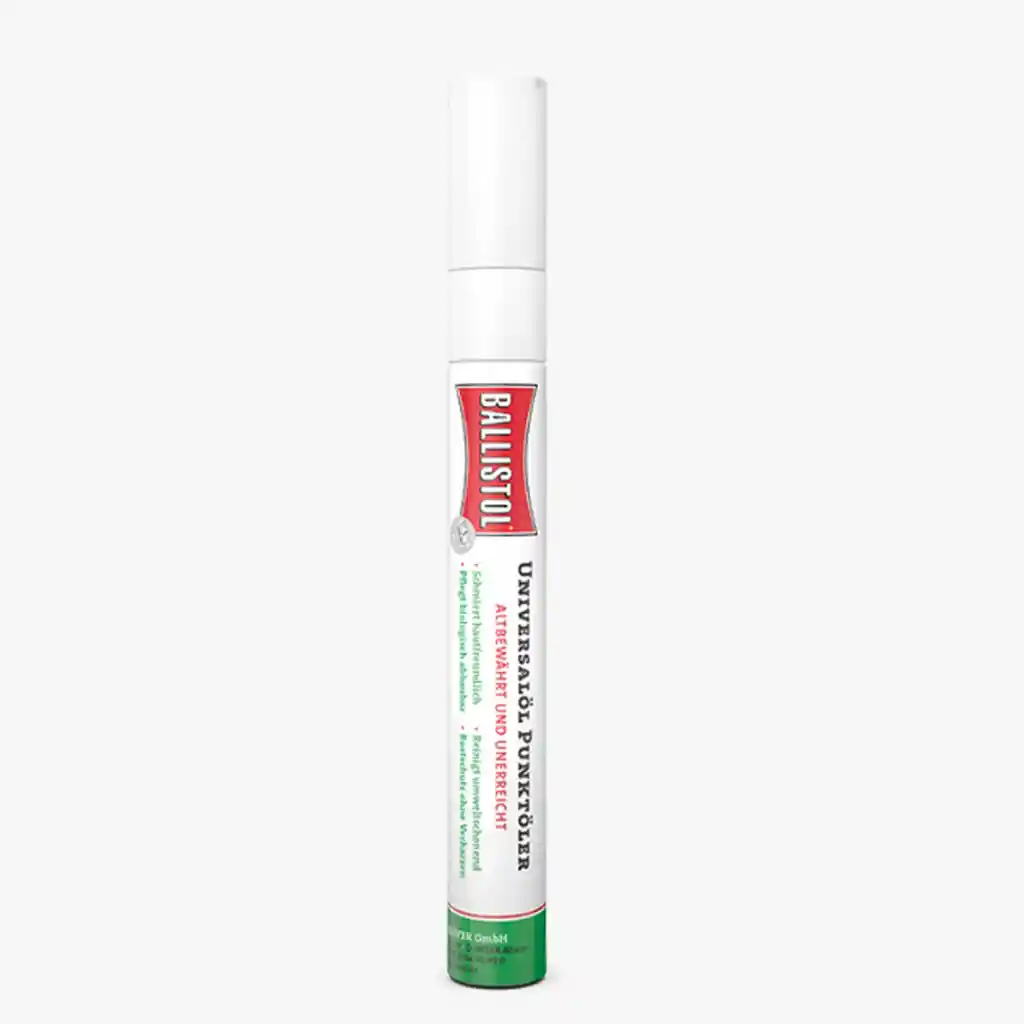 ACEITE BALL UNIVER LAP 15ml 21360 Puntero Aceite lubricante universal Lapiz Aplicador de Aceite Lubricante Universal Oil Accurate Applicator Marca BALLISTOL Modelo 21360 EAN 4017777213607 Recomendable rellenar con Aceite lubricantes Marca Ballistol Universal Cantidad 15 mls Viene relleno con este aceite (tambien sirve para otros aceites liquidos) Saque la tapa y desatornille la punta Retire el encaje dosificador Rellene con hasta 15 mls de aceite (ante primer uso sumerja la punta varias veces en el encaje dosificador) Atornille bien y limpie con un papel absorbente Sacuda el lapiz y listo para aplicar Aplicacion sacudir bien antes de aplicar Facil penetracion y precision en la aplicacion Para la lubricacion y proteccion focalizada Aplicacion limpia y presiza Presentacion Lapiz aplicador Volumen a rellenar 15 ml Peso bruto 23 grs (vacio) Medidas frasco alto 14 cms, diametro 1,5 cms Material Plastico Fabricado en Alemania