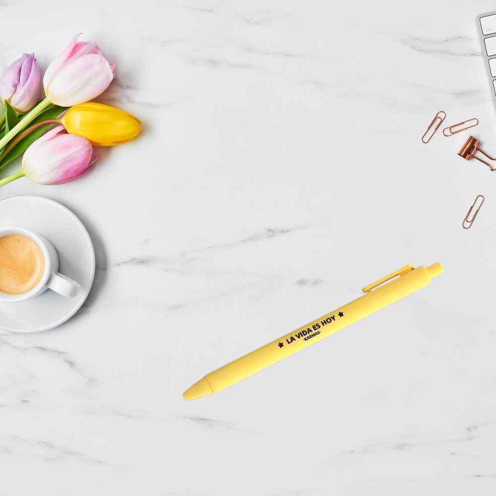 Lindo lápiz amarillo con la frase: "La vida es hoy", de tinta gel negra en 0,5 mm. ¡Verás lo agradable que es escribir con él, úsalo para organizarte, escribir tus pendientes, pensamientos, reflexiones, lo que tú más quieras!