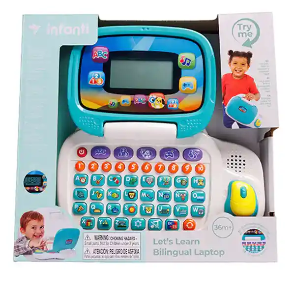 Un portátil educativo que abre la puerta al aprendizaje bilingüe, jugando y descubriendo. Un laptop interactivo que enseña inglés y español con juegos, música y animaciones. Este portátil bilingüe permite a los niños aprender inglés y español mediante 5 categorías educativas que enseñan letras, números, animales, alimentos y más. Con pantalla LCD animada, mouse ergonómico y botones que se transforman en notas musicales, ofrece una experiencia completa de juego y aprendizaje El Pre-school Bilingual Laptop es un computador educativo diseñado para introducir a los niños al aprendizaje bilingüe. Incluye 5 categorías de juego que enseñan letras, palabras, números, figuras, animales y alimentos. Cuenta con una pantalla LCD llena de animaciones, un mouse ergonómico y funciones como repetición, control de volumen y contraste. Su diseño portátil con asa facilita llevarlo a cualquier lugar para aprender jugando. • Enseña dos idiomas: inglés y español. 5 categorías de aprendizaje: • Letras & Palabras • Números & Formas • Animales & Alimentos • Juegos • Music Time • Pantalla LCD grande con animaciones divertidas. • Mouse ergonómico con función de comando y movimiento en cuatro direcciones. • Botones numéricos que se convierten en 10 notas musicales. • Controles de repetición, volumen y contraste. • Asa de agarre fácil para llevarlo a todas partes. Beneficios • Introduce el bilingüismo desde la primera infancia. • Fortalece la memoria, la concentración y el reconocimiento de letras y números. • Estimula la coordinación mano-ojo con su mouse ergonómico. • Fomenta el juego interactivo con música, animaciones y actividades variadas.