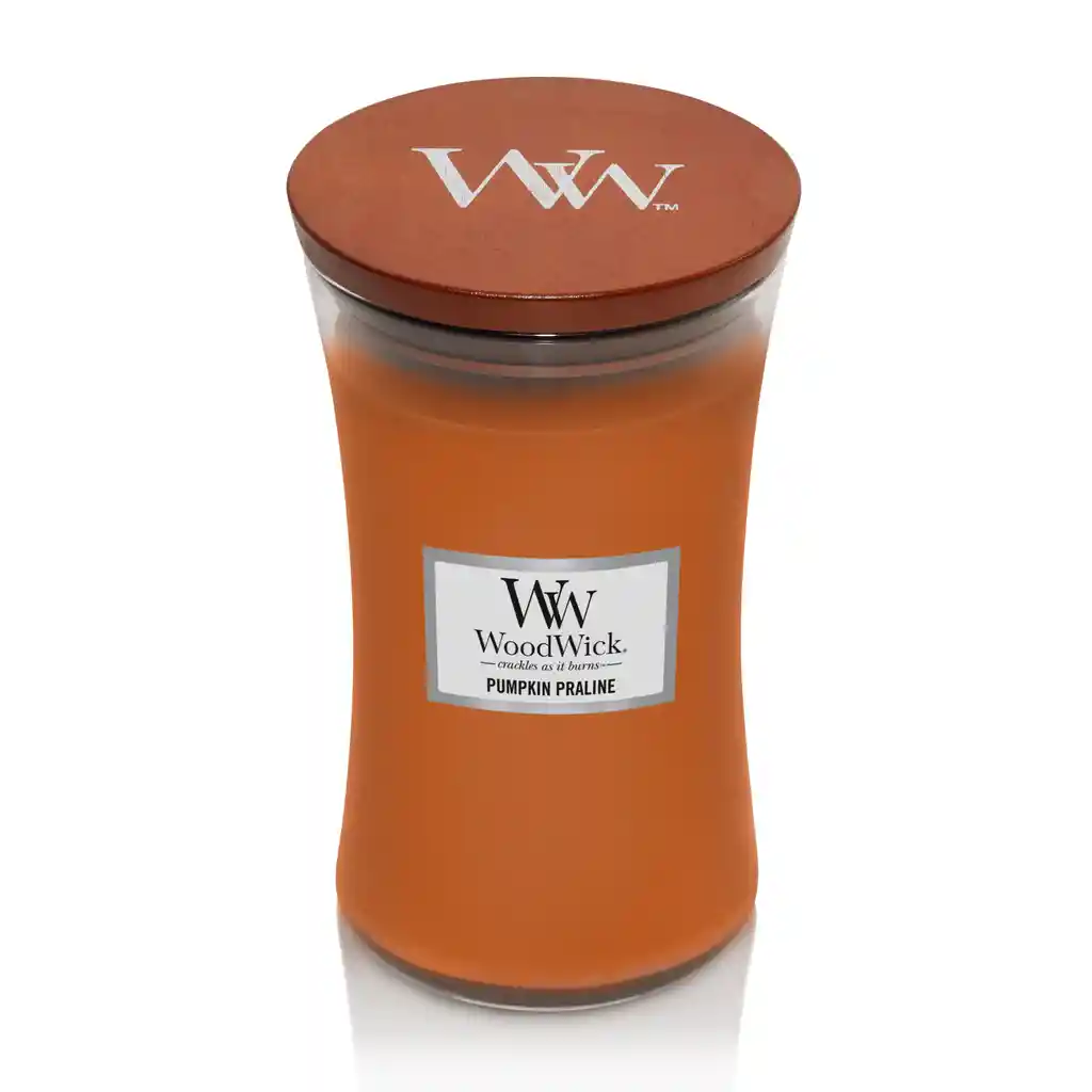 Vela Hourglass Grande Pumpkin Praline Pumpkin Praline: Una fragancia indulgente de calabaza endulzada con arce y especiada con jengibre y nuez moscada. Impresiones: Calabaza, pacana, anís estrellado, nuez moscada - Puré de calabaza, canela, jengibre - Leche Condensada, Arce, Vainilla Las velas grandes con silueta de reloj de arena WoodWick® llenan su hogar con el suave crujido y los aromas acogedores y una mecha de madera natural que cruje mientras arde ™. El crepitante relajante de una vela WoodWick® es creado por una tecnología patentada PLUSWICK®, diseñada para garantizar una experiencia de crepitación segura y consistente para una fragancia más rápida y un mejor quemado mientras perfuma su hogar con el sonido relajante de un fuego crepitante. (4.0 "x 7.0") Especificaciones Cera: la parafina premium y las ceras de soya se mezclan con fragancias altamente concentradas para producir un hermoso quemado sin residuos sucios. Olor: cuidadosamente seleccionado y probado para garantizar que la vela llene la habitación con su aroma duradero. Peso: 1100g