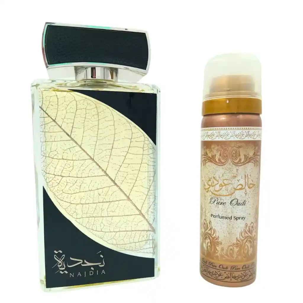 Najdia de Lattafa Perfumes es una fragancia de la familia olfativa Aromática Acuática para Hombres y Mujeres. Najdia se lanzó en 2020. Las Notas de Salida son limón (lima ácida), canela, manzana, bergamota y hierba limón (zacate limón); las Notas de Corazón son notas acuosas, lavanda, cardamomo y romero; las Notas de Fondo son almizcle, ámbar, sándalo, cedro y tabaco. + Desodorante Corporal 50 ml