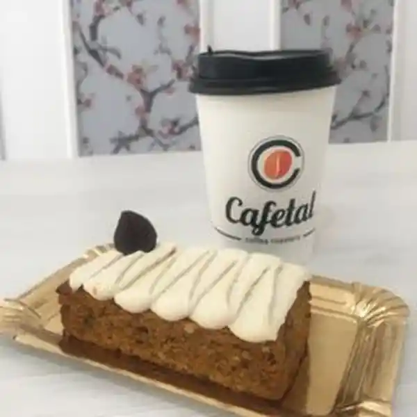 Café de grano 70% arabico y 30% robusta de textura cremosa y gran cuerpo + pastel a elección sin gluten y sin azúcar.