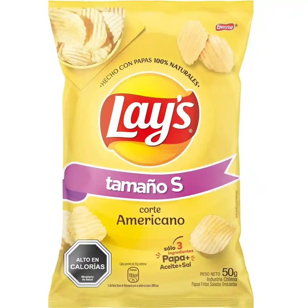 Las Lays tamaño S (50g) Corte Americano son papas fritas clásicas, de corte más grueso y ondulado, hechas con papas naturales, aceites vegetales y sal, ofreciendo una textura extra crujiente y un sabor intenso para una pausa de snack, ideales para disfrutar solas o con dips.