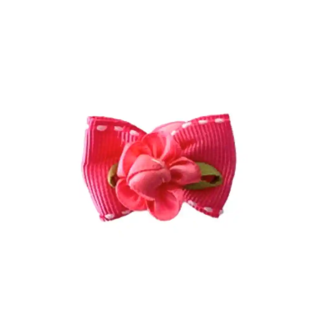 Diseño: Lazo de cinta rosada. tipo "grosgrain" o falla con una flor decorativa en el centro y pequeños detalles de hojas verdes. Se sujeta mediante bandas elásticas