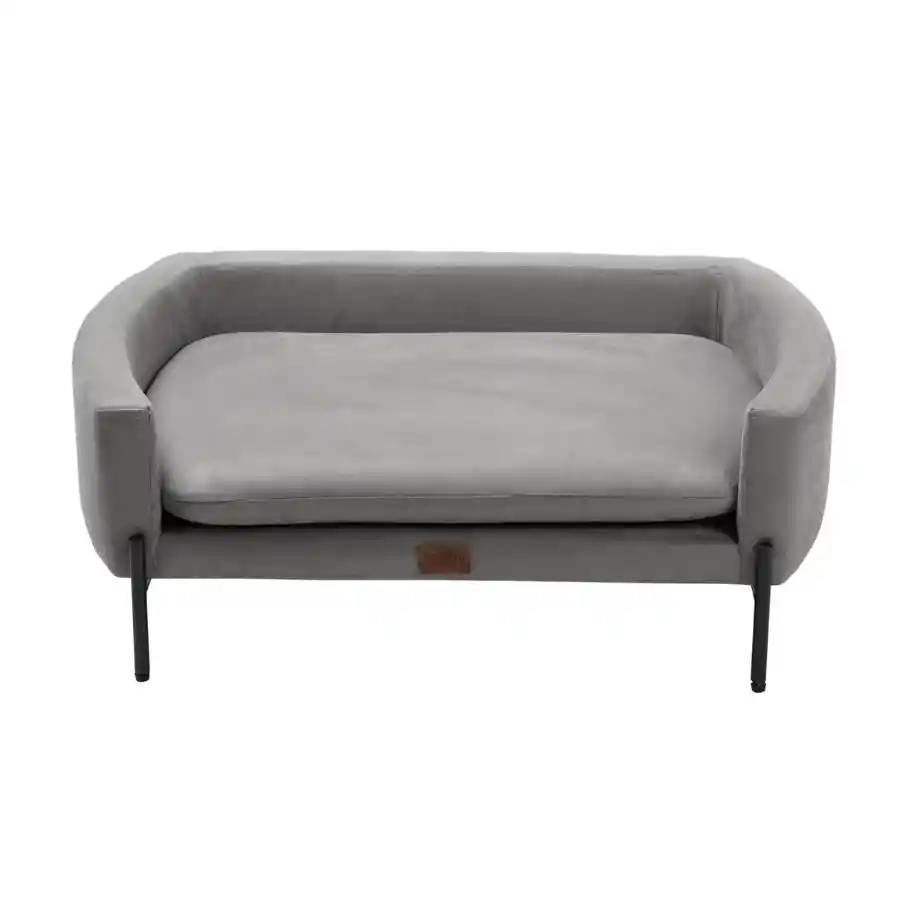 Sofá elevado con tapizado en gamuza sintética gris, acolchado de espuma y base antideslizante: elegancia, confort y durabilidad para el descanso de tu perro.