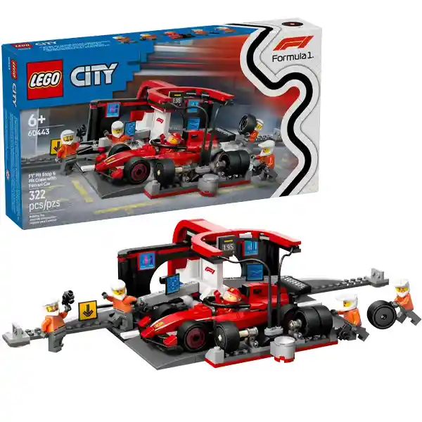¡Lleva las emociones de los circuitos al juego de tu peque con el set de construcción LEGO® City Parada en Boxes de F1® y Equipo de Mecánicos con Coche Ferrari (60443)! Este set para niños a partir de 6 años tiene todo lo que necesitan para una puesta a punto relámpago, como neumáticos lisos nuevos, pistolas neumáticas y un equipo que se coloca en posición al accionar una palanca para cambiar las ruedas a velocidad turbo. El juego, que contiene un coche de carreras de Formula 1® Ferrari y minifiguras de un piloto y 4 mecánicos, es perfecto para aficionados al automovilismo. Este juguete LEGO de F1 incluye una guía de construcción paso a paso impresa e instrucciones digitales en la app LEGO Builder, que permite acercar y girar los modelos en 3D, consultar el progreso o explorar y guardar otros sets. Recrea palpitantes competiciones con este set LEGO City F1, ideal como regalo. Descubre la dinámica gama de kits LEGO inspirados en la F1 (a la venta por separado) para peques y adultos. Vehículo de F1® de juguete LEGO®: Lleva las emociones de las carreras de Formula 1® al juego de tu peque con el set LEGO City Parada en Boxes de F1 y Equipo de Mecánicos con Coche Ferrari para mayores de 6 años ¿Qué contiene la caja? Todo lo que los niños necesitan para construir una parada en boxes de F1® y un coche Ferrari de juguete, además de minifiguras de un piloto y 4 mecánicos Set de construcción de un modelo de F1® con divertidas funciones: Entra en boxes con el monoplaza y, accionando una palanca, coloca al equipo de mecánicos en posición para cambiar las ruedas a velocidad turbo Set LEGO® inspirado en la F1® con accesorios para recrear con realismo una parada en boxes: Incluye herramientas, neumáticos lisos nuevos, pistolas neumáticas y más accesorios para minifiguras LEGO Un divertido regalo de cumpleaños para niños y niñas: Sorprende a tu joven piloto de competición con este juego LEGO® City F1® para peques a partir de 6 años Construcción asistida por divertidas herramientas digitales: Las instrucciones de este juguete de F1® están disponibles en la app LEGO® Builder, que te permite acercar y girar modelos en 3D mientras construyes, consultar tu progreso y guardar sets Más acción de la Formula 1® a gran velocidad: Descubre los demás sets de construcción LEGO® basados en la F1® (a la venta por separado) para construir, exponer y competir con toda la familia Dimensiones: El modelo de la parada en boxes de este set LEGO® City de 322 piezas mide aproximadamente 8 cm de altura, 14 cm de anchura y 5 cm de profundidad