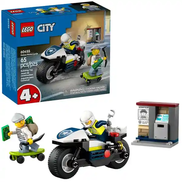 ¡Sorprende a tu joven héroe de acción con el emocionante juego LEGO® City Persecución en Moto de Policía (60455)! Perfecto para pequeños constructores a partir de 4 años, incluye una increíble moto de policía con ruedas anchas, el monopatín de huida de un ladrón y un cajero automático con un billete de juguete. Solo tienes que agregar las minifiguras de la agente de policía y el ladrón, y los imaginativos juegos e historias empezarán a cobrar vida y durarán horas. Este set con un vehículo de policía fácil de construir viene con un ladrillo LEGO para principiantes y una guía visual. O puedes embarcar a tu héroe cotidiano en un apasionante viaje creativo usando como pasaporte las instrucciones digitales disponibles en la app LEGO Builder. Los sets de construcción LEGO City Policía ofrecen trepidantes aventuras de construcción y juego. ¡Prepárate para nuevas aventuras aún más grandiosas combinando este juego con otros de la gama LEGO City (a la venta por separado)! Contiene 65 piezas. Moto de policía de juguete para mayores de 4 años: Descúbrele a tu héroe cotidiano todo un mundo de juego imaginativo con el set LEGO® City Persecución en Moto de Policía ¿Qué contiene la caja? Trae todo lo necesario para que los niños construyan una moto de policía de juguete, un monopatín y un cajero automático, además de minifiguras de una agente de policía y un ladrón patinador para interpretar historias Un juguete para quienes disfrutan jugando a recrear situaciones cotidianas: Los peques sientan a la agente de policía en la moto patrulla, ponen al ladrón sobre el monopatín y colocan el billete de juguete dentro del cajero automático Divertidos accesorios: Este set de construcción de policía viene con accesorios para minifiguras LEGO®, como un billete de juguete, un cartel de “Se busca”, una linterna, unas esposas y una palanca Juego con un vehículo de policía fácil de construir: Incluye un ladrillo LEGO® para principiantes, una sencilla guía de construcción visual e instrucciones digitales 3D, disponibles en la app LEGO Builder Una divertida idea de regalo para héroes cotidianos: Sorprende a un peque a partir de 4 años con este set LEGO® City en ocasiones especiales, como una fiesta, o un día cualquiera, solo porque sí Para divertirse aprendiendo: Los sets de juguetes construibles LEGO® City ayudan a los niños a adquirir confianza y desarrollar habilidades fundamentales para la vida a través del juego creativo libre Dimensiones: El modelo de la moto de policíade este set de 65 piezas con vehículos de juguete mide aproximadamente 4 cm de altura, 9 cm de longitud y 4 cm de anchura