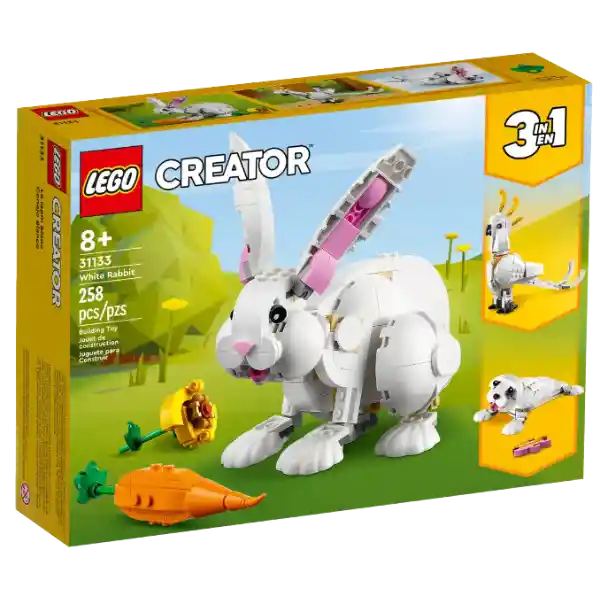 Los niños a partir de 8 años podrán interpretar divertidas historias con el fantástico set LEGO® Creator 3en1 Conejo Blanco (31133), un conejito de juguete para construir con cabeza, patas, boca y orejas articuladas que viene con 2 opciones de tentempiés: una zanahoria o una flor. Este set LEGO Creator 3 en1 ofrece a los peques 3 experiencias de construcción y juego diferentes: primero pueden crear un conejito de juguete y, después, convertirlo en una preciosa cacatúa que come semillas o en una adorable foca blanca con un pescadito como alimento. Usar la app LEGO Builder para acercar, girar y visualizar en su tableta o su smartphone el modelo físico que están construyendo permite a los jóvenes constructores dar vida a su creación para guiarse durante el proceso y, al terminar, disfrutar de la gratificante sensación de logro que les producirá haberlo hecho solos. El conejo mueve la cabeza, las patas, la boca y las orejas; la cacatúa mueve las alas, la cola y el cuello, y gira la cabeza 360 grados; y la foca mueve la boca y las aletas. El conejo de juguete viene con una zanahoria o una flor, la cacatúa puede “comer” semillas y la foca tiene un pescadito que se le puede colocar en la boca. Este set de 258 piezas ofrece a los niños a partir de 8 años una emocionante experiencia de construcción y, además, es la recompensa perfectapara apasionados fans de LEGO®. El conejo de juguete mide aproximadamente 15 cm de altura, un tamaño totalmente portátil, ideal para que los peques se lo lleven a todas partes. Se recomienda de 8 años en adelante.