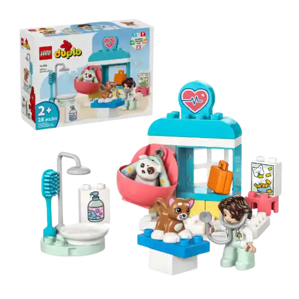 Regala a tu pequeño amante de los animales el set Mi Ciudad LEGO® DUPLO® Visita al Centro Veterinario para fomentar su instintiva sensibilidad hacia los demás. Este set infantil enseña a los preescolares a empatizar con los animales proponiéndoles imaginar que son una veterinaria y que curan a las figuras de juguete de un perro y un gato. Los bebés pueden usar el estetoscopio de juguete, pesar a las figuras de las mascotas en la báscula, cepillarlas, ducharlas, acostarlas en la cuna y mecerlas hasta dormirlas. Este juego veterinario incluye una cuna mecedora, una manta de tela táctil y ventanas abisagradas para que los deditos practiquen las habilidades motrices finas. Los elementos y ladrillos de este set LEGO® DUPLO® con animales se han dejado caer, calentado, aplastado, retorcido y analizado para tener la garantía de que satisfacen exigentes estándares de seguridad infantil. Mediante escenas, modelos, características, figuras y animales que los bebés reconocen perfectamente, los sets Mi Ciudad LEGO® DUPLO® les ayudan a entender el entorno que ven a su alrededor. Este set de juguetes con animales, compuesto por 28 piezas, mide aproximadamente 15 cm de altura, 26 cm de anchura y 14 cm de profundidad. Se recomienda de 2 años en adelante.