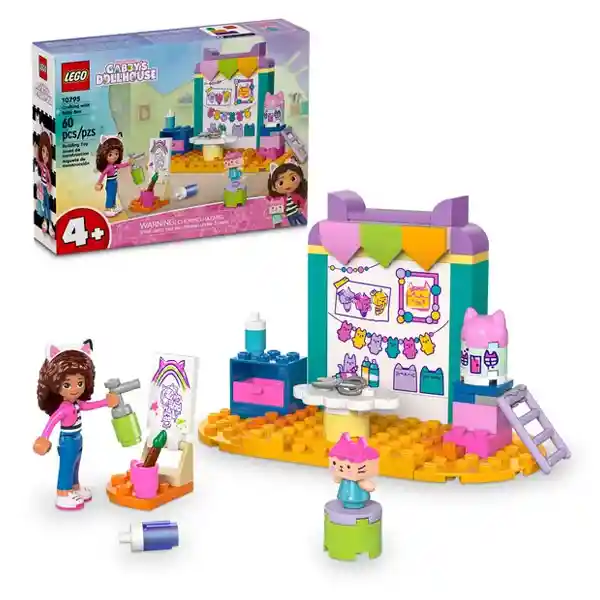 El set LEGO® 4+ La casa de muñecas de Gabby Creaciones con Bebé Box (10795) es un juguete para niños y niñas de 4 años o más orientado al juego simbólico y diseñado para desarrollar la creatividad y fomentar el juego imaginativo. Este modelo está lleno de brillantes colores, conocidos personajes y divertidas características que reconocerán y adorarán los fans de La casa de muñecas de Gabby, de DreamWorks Animation. Este juguete LEGO es también un juego de manualidades. Incluye un pincel, pintura, tijeras y aerosol, además de un minipersonaje de Gabby y una figura de Bebé Box. Juntos, Gabby y Bebé Box pintan un cuadro y construyen una maqueta de la casa de muñecas de ella. Hay una escalera para ayudar a los personajes a llegar a la parte superior de la maqueta. Tiene una pared cubierta de obras de arte y asoman orejas de gato por arriba. El set, con detalles para estimular el juego creativo, cuenta con un ladrillo para principiantes e instrucciones en forma de colorida historia visual. Juguete basado en actividades artísticas: Los fans de La casa de muñecas de Gabby, de DreamWorks Animation, sacan su lado creativo con el set Creaciones con Bebé Box, diseñado para activar la imaginación de las niñas y los niños a partir de 4 años Juego creativo para peques: Incluye un minipersonaje de Gabby, una figura de Bebé Box y material para realizar manualidades, como pintura, un pincel, tijeras y aerosol Juguete orientado al juego simbólico: Los peques ayudan a Gabby y Bebé Box a pintar un cuadro y a construir una maqueta de la casa de muñecas de Gabby; los personajes cuentan con una escalera de mano para llegar a las partes altas Entretenido juguete preescolar: El ladrillo para principiantes y los modelos de construcción rápida del set garantizan que los más jóvenes puedan empezar a divertirse construyendo y jugando enseguida Regalo para niñas y niños de 4 años en adelante: Promueve el juego creativo y se ha diseñado para motivar y entretener a los fans de los juguetes de manualidades, los sets de construcción y La casa de muñecas de Gabby, de DreamWorks Animation Más juegos inspirados en La casa de muñecas de Gabby: Explora la gama completa de sets de construcción LEGO® 4+ La casa de muñecas de Gabby (a la venta por separado) para descubrir más formas de jugar todavía Juguete preescolar construible: La amplia variedad de atractivos sets LEGO® para el desarrollo dirigidos a niños a partir de 4 años introducen a los peques en un gran universo de populares películas, personajes de televisión y héroes cotidianos Juego de 60 piezas basado en el arte de pintar: La sala de manualidades principal mide aproximadamente 8 cm de altura, 13 cm de anchura y 6 cm de profundidad