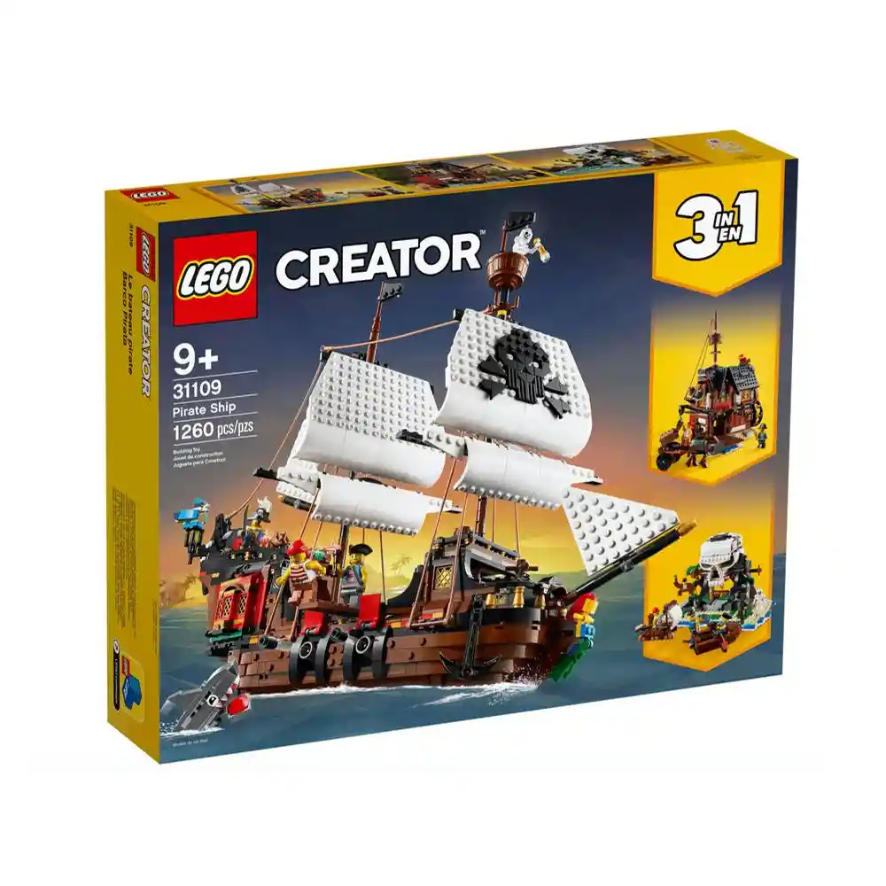Incluye 1260 Unidades. Fomenta el Juego Creativo y Ofrece a Los Niños 3 Maquetas en 1: El Clásico Barco Pirata Una Taberna Pirata Rústica y la Misteriosa Isla Calavera. al Construir y Reconstruir el Juego Sigue y Sigue. Los Niños Podrán Potenciar Sus Habilidades Creativas y de Construcción Con el Super Detallado Barco Pirata de Juguete Visitar la Taberna Pirata Para Saciar el Hambre Explorar la Isla Calavera o Crear Una Maqueta Totalmente Nueva. Este Set Ofrece 3 Opciones de Construcción: El Barco Pirata Lego Creator 3 en 1 (31109) Una Taberna Pirata o la Isla Calavera Juega Con Cada Modelo o Combínalo Con Otros Sets. El Set Incluye También 3 Minifiguras Para Ampliar Las Posibilidades de Juego. El Barco Pirata Mide Aproximadamente 37 cm de Altura 46 cm de Longitud y 19 cm de Anchura. Con Las Claras Instrucciones Muy Fáciles de Seguir el Montaje es Sencillísimo Para Los Peques Que Disfrutarán de Una Gratificante Experiencia de Construcción y de Toneladas de Diversión Creativa. Se Recomienda de 9 Años en Adelante.