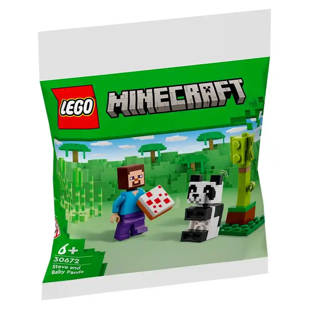 Steve, el popular personaje Minecraft®, va a darle de comer un pedazo de pastel al panda bebé, ¿pero crees que el simpático animalito preferirá mordisquear el bambú cercano?