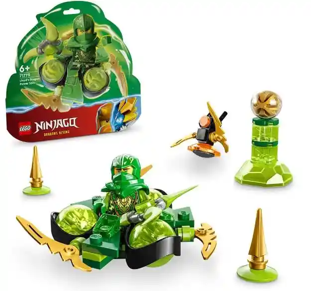 Los fans de los ninja a partir de 6 años pueden ayudar a Lloyd Dragon Power a entrenarse en un circuito de obstáculos con el juego LEGO® NINJAGO® Lloyd Dragon Power: Ciclón Spinjitzu (71779). El juego viene con una minifigura de Lloyd Dragon Power, así como con una figura del Droide de Imperium que se cae y se vuelca cuando recibe un golpe. Los niños colocan a Lloyd Dragon Power dentro del spinner adornado con 3 exclusivos elementos de poder dragón verdes y lo hacen girar para verle dar rapidísimas vueltas y realizar diferentes trucos. Este resistente juego incluye, además, un núcleo de energía dragón dorado coleccionable en una copa, que Lloyd Dragon Power debe ganar, y 2 obstáculos punzantes. Descubre también los 2 juguetes de acción NINJAGO® Kai Dragon Power: Tornado Spinjitzu (71777) y Nya Dragon Power: Derrape Spinjitzu (71778). Este juego de 56 piezas seconstruye rápidamente para empezar a entrenar a Lloyd Dragon Power enseguida. Es fantástico como obsequio de cumpleaños o regalo solo porque sí para niños y niñas a partir de 6 años. El juguete giratorio, con unas medidas aproximadas de 5 cm de altura, 8 cm de longitud y 17 cm de anchura, tiene el tamaño perfecto para llevarlo a las reuniones de juego en las casas de los amigos. La app LEGO® Builder guiará a los peques durante la intuitiva aventura de construcción. Podrán controlar su avance en el proceso, guardar sets, y acercar y girar sus modelos en 3D a medida que los construyen.
