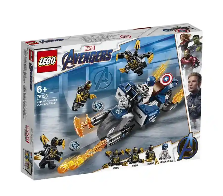 Participa en la batalla contra los Outriders con la alucinante moto del Capitán América en LEGO Marvel Vengadores Capitán América: Ataque de los Outriders (76123). La moto de juguete para construir cuenta con una cabina para una minifigura, 2 lanzadores de escudos del Capitán América, 2 blásteres desmontables que no disparan, puntos de conexión para minifiguras y soporte para motos abatible. Este set de construcción para niños incluye 4 personajes Marvel (entre ellos, una minifigura del Capitán América con casco, decorada con el traje del equipo Vengadores) para recrear las emocionantes escenas de la saga Marvel Vengadores.