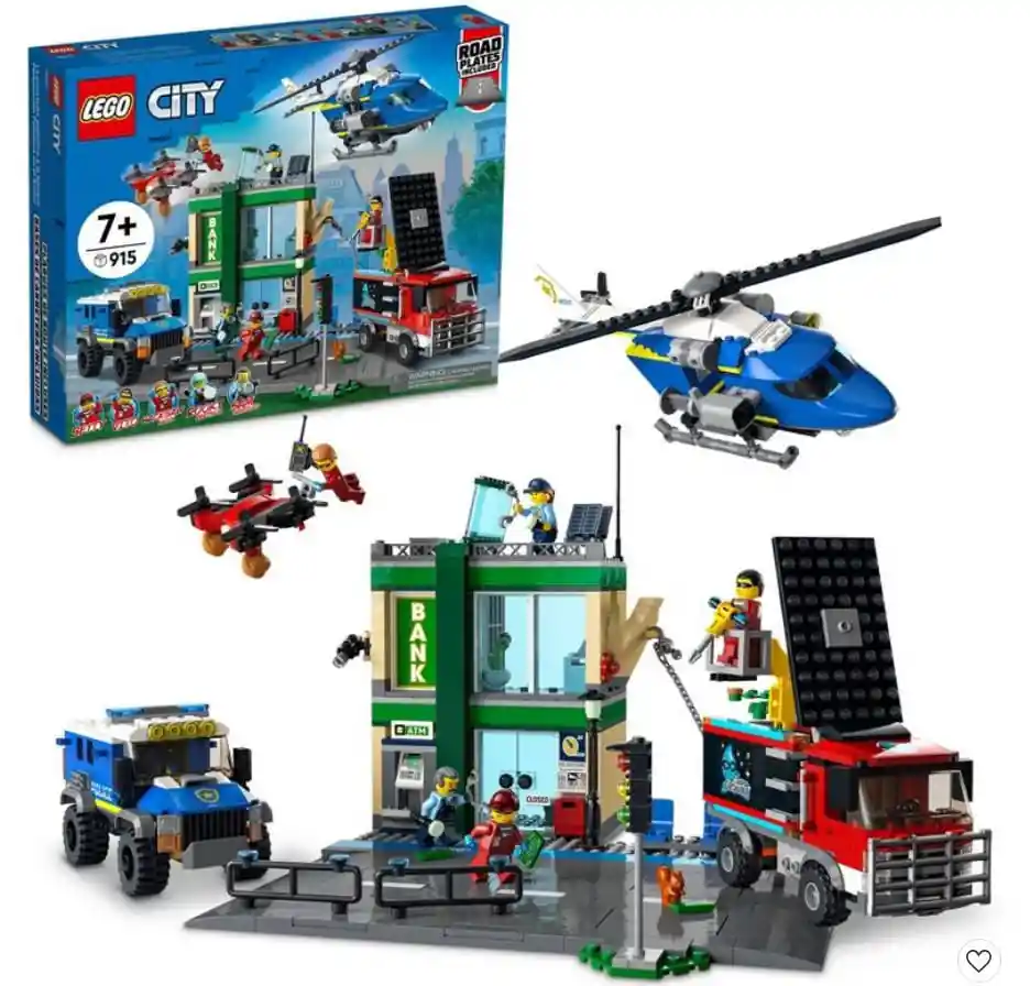 Contiene 915 Piezas ¡La Acción no Tiene Fin Con el Juego Lego City Persecución Policial en el Banco (60317)! Contiene un Banco Lleno de Funciones un Camión de Limpieza Convertible en un Vehículo de Atraco de Los Ladrones un Helicóptero de Policía un Camión de Policía y 6 Minifiguras Entre Ellas 5 Populares Personajes de la Serie Lego City: Aventuras en la Ciudad Además de un Sistema de Bases de Carretera Para Conectar el Set a Otros Juegos Lego. Construcción y Juego Para Niños a Partir de 7 Años Este Set de Construcción Lego Incluye Instrucciones Paso a Paso Impresas y en Versión Digital. Disponible en la App Gratuita Instrucciones de Montaje Lego la Guía Digital Cuenta Con Intuitivas Herramientas de Acercamiento y Giro Que Permiten a Los Niños Visualizar Cada Maqueta Desde Todos Los Ángulos Mientras la Construyen.