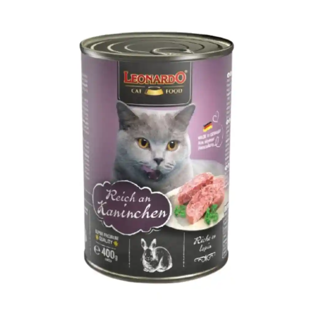 Quality Selection Conejo de LEONARDO® Es carne de alta calidad en lata, es ideal para una alimentación BARF*. Los gatos, al igual que los felinos que viven en el medio natural, son carnívoros. Este es el por qué solamente se utilizan productos cárnicos frescos. Gracias a la alta disponibilidad biológica y a la alta calidad de estos productos, su gato necesita una cantidad relativamente pequeña para satisfacer sus necesidades nutricionales diarias. LEONARDO® goza de haber sido el ganador en 2016 y 2017 del premio al producto más novedoso del año en comercios alemanes. Solo con pasión se puede transformar algo bueno en algo especial. Este entusiasmo lo comparten desde hace décadas nuestros nutricionistas, veterinarios y múltiples empleados, cuando elaboran el alimento para gatos LEONARDO® con ingredientes saludables. Movidos por esta dedicación, han encomendado a un equipo de expertos el desarrollo de un método de cocción de comida felina apto para carne fresca de procedencia local, en lugar de carne seca. La mayoría de los gatos la prefieren y a nosotros nos permite influir directamente en la calidad. Las ventajas de este producto son: Carne de Alta Calidad: Ingredientes de alta calidad. BARF*: Esta lata es ideal para combinar una alimentación BARF* Fuente de Proteína: También ideal como buena fuente de proteína en dietas. Garantía de Calidad: Garantizado a partir de los mejores ingredientes con excelente sabor y palatabilidad. Además contiene proteína derivada directamente de carne apta totalmente para el consumo humano.