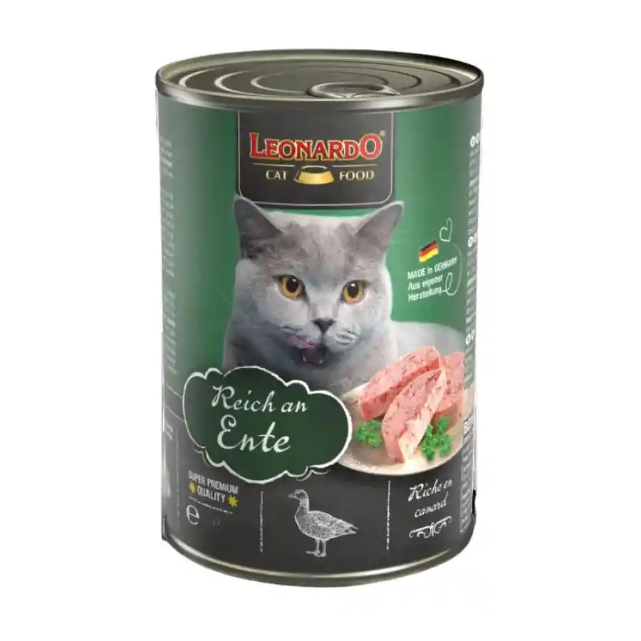 Leonardo Lata Pato es un alimento húmedo para gatos rico en pato. En su fórmula solamente se utilizan productos cárnicos frescos. Gracias a la alta disponibilidad biológica y a la alta calidad de estos productos, su gato necesita una cantidad relativamente pequeña para satisfacer sus necesidades nutricionales diarias. Los gatos son animales estrictamente carnívoros y necesitan comer principalmente proteínas de origen animal para permanecer sanos y fuertes. Con Leonardo Finest Selection su mascota podrá ingerir pequeñas dosis de alimento húmedo que le proporcionarán una gran cantidad de proteínas con un gran valor biológico para saciar sus necesidades nutricionales. Guía de alimentación: 200-400g diarios para gatos entre 3-5 kg. Administrar a temperatura ambiente. Asegúrese de que el animal disponga de agua fresca en todo momento. Una vez abierto, manténgase en el frigorífico un máximo de 24 horas.